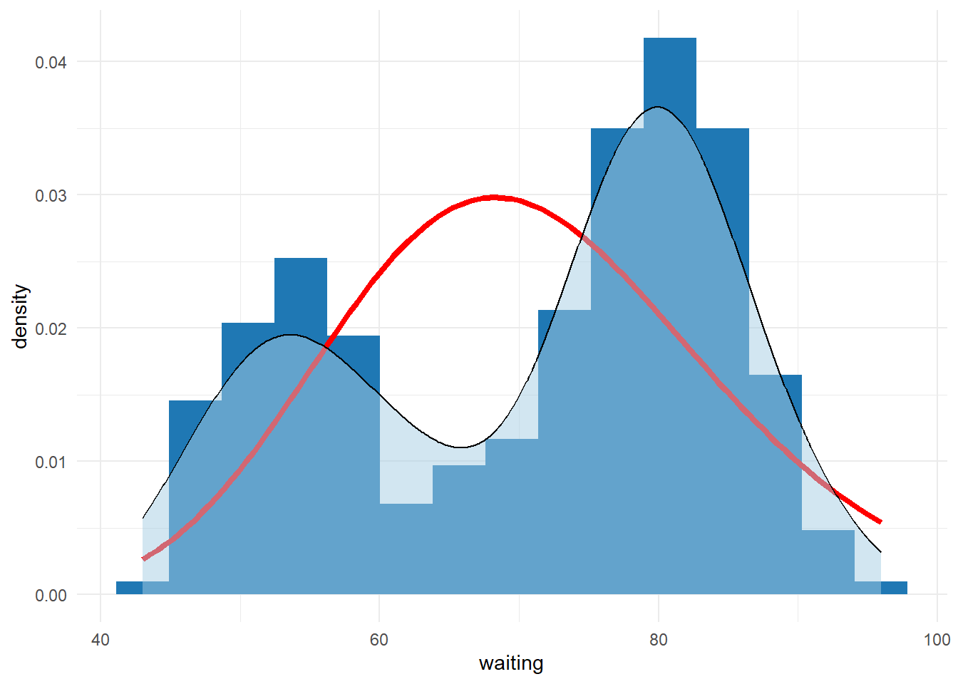 The faithful dataset contains 272 observations of eruption waiting times (in minutes) for the Old Faithful geyser in Yellowstone National Park.