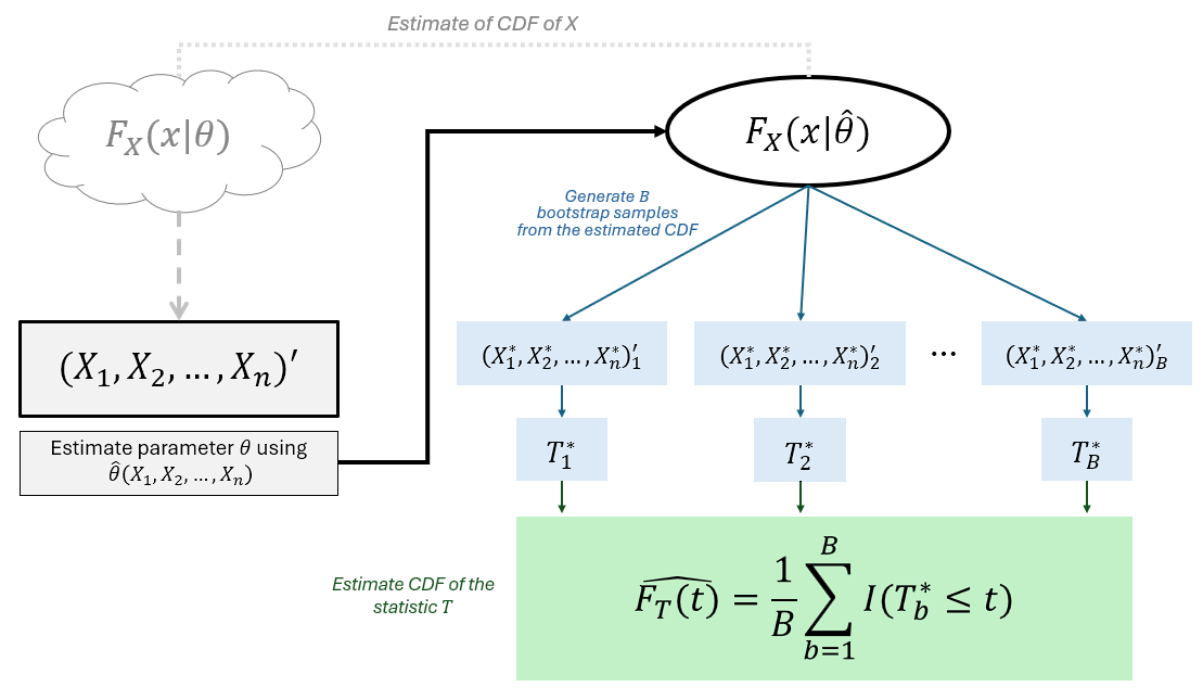 The general steps for parametric bootstrapping for a statistic \(T(X_1,....,X_n)\) is as follows: