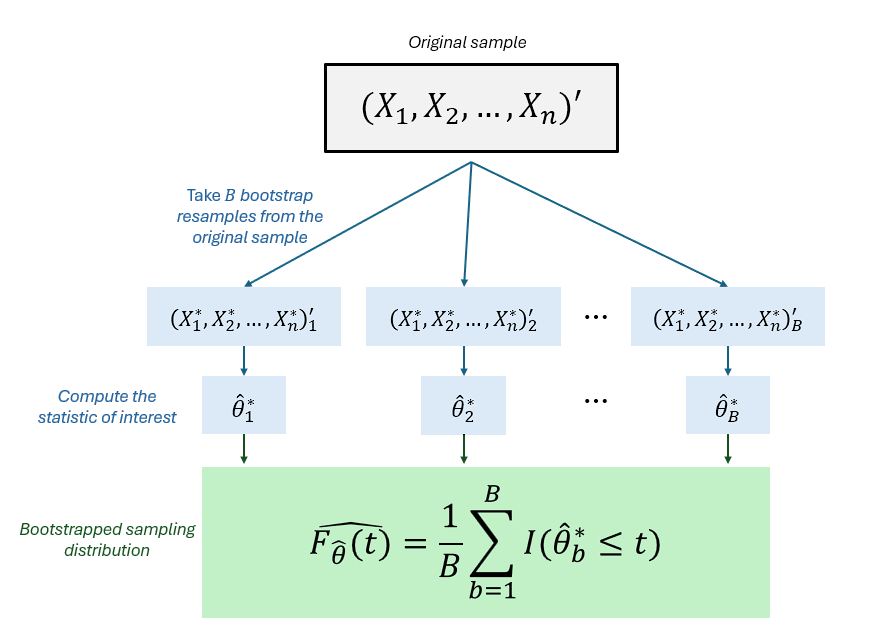 A general outline of the estimation procedure for any population parameter \(\theta\) using the nonparametric bootstrap is summarized below:
