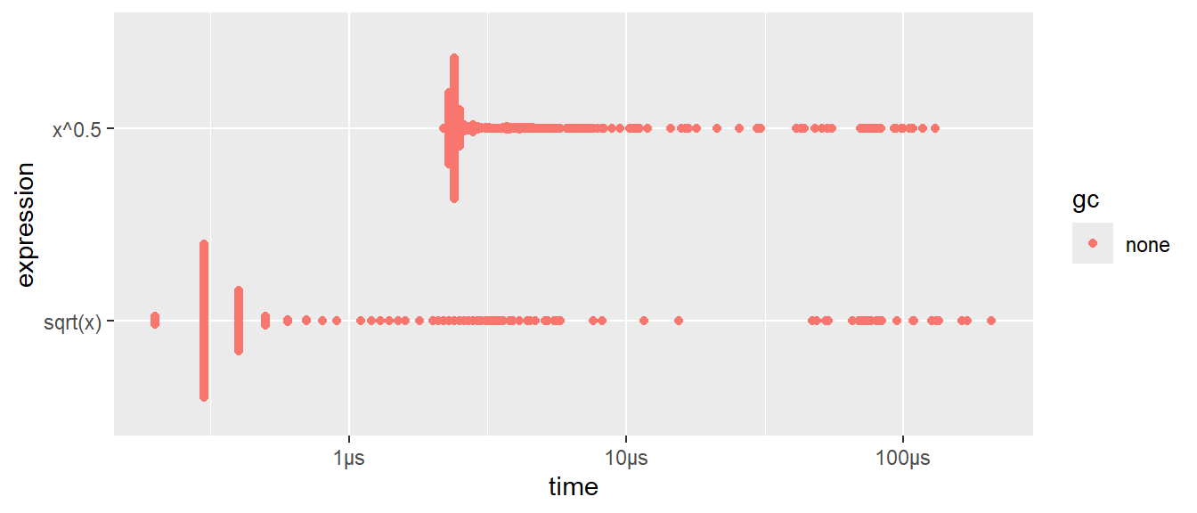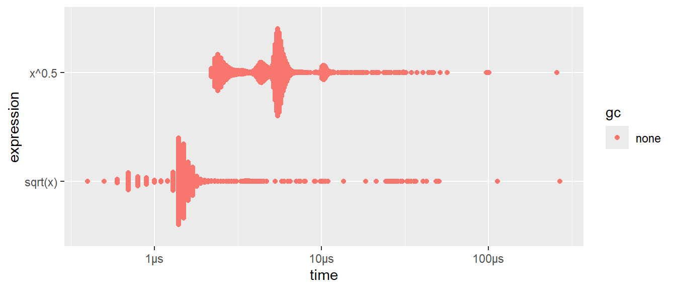 sqrt()function is faster than the general exponentiation operator.You can visualize the distribution of the individual timings with