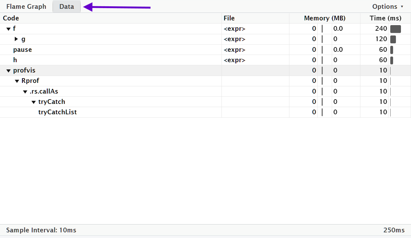 That quickly grows beyond our ability to look at directly, so instead of using utils::Rprof() we’ll use the profvis package to visualize aggregates.