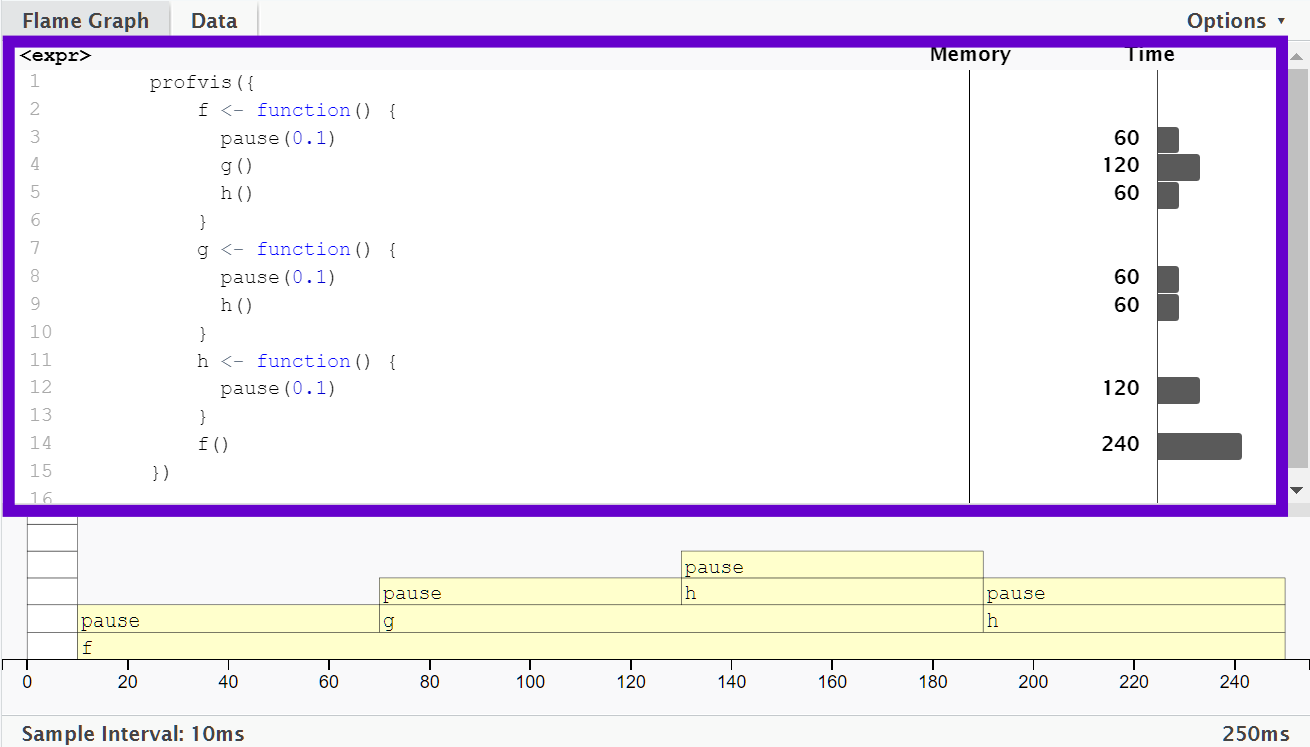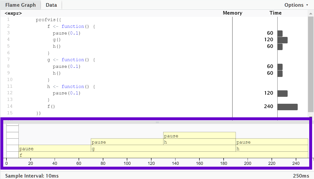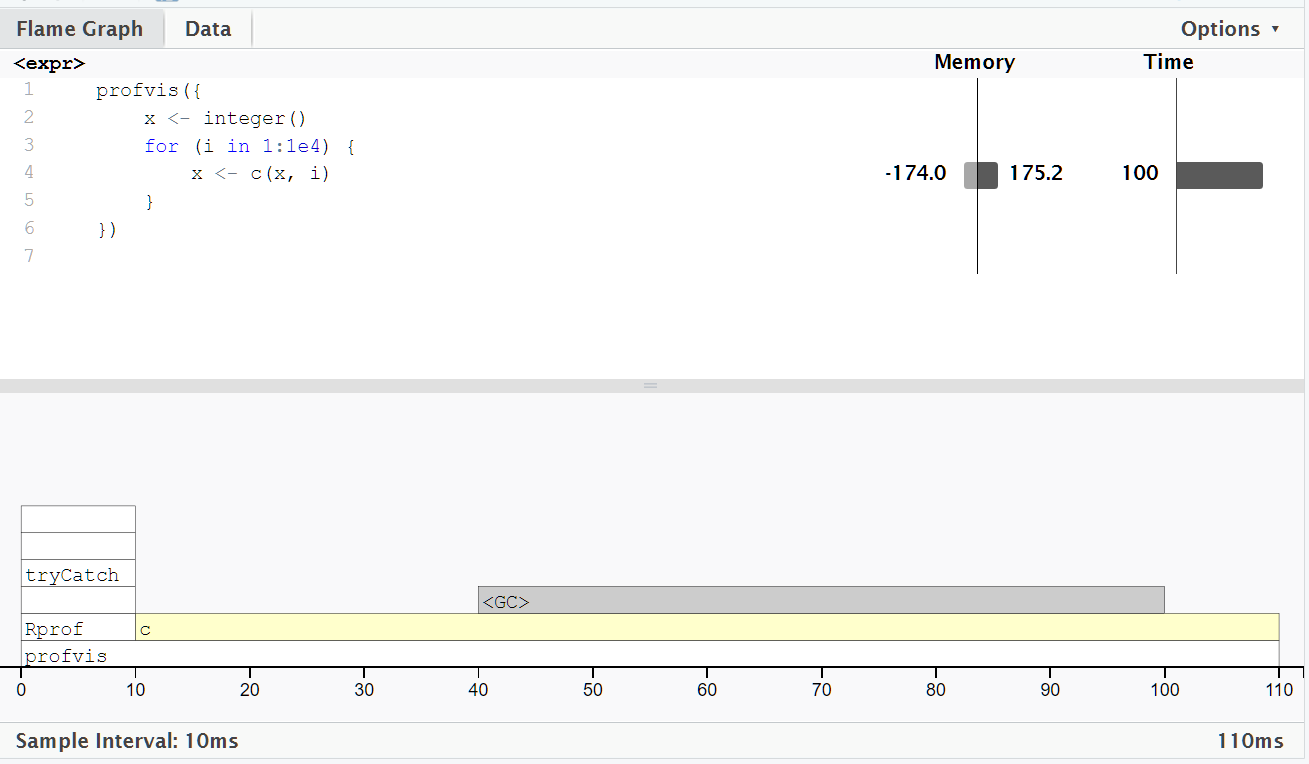 profvis is a tool for helping you to understand how R spends its time. It provides a interactive graphical interface for visualizing data from Rprof(), R’s built-in tool for collecting profiling data.