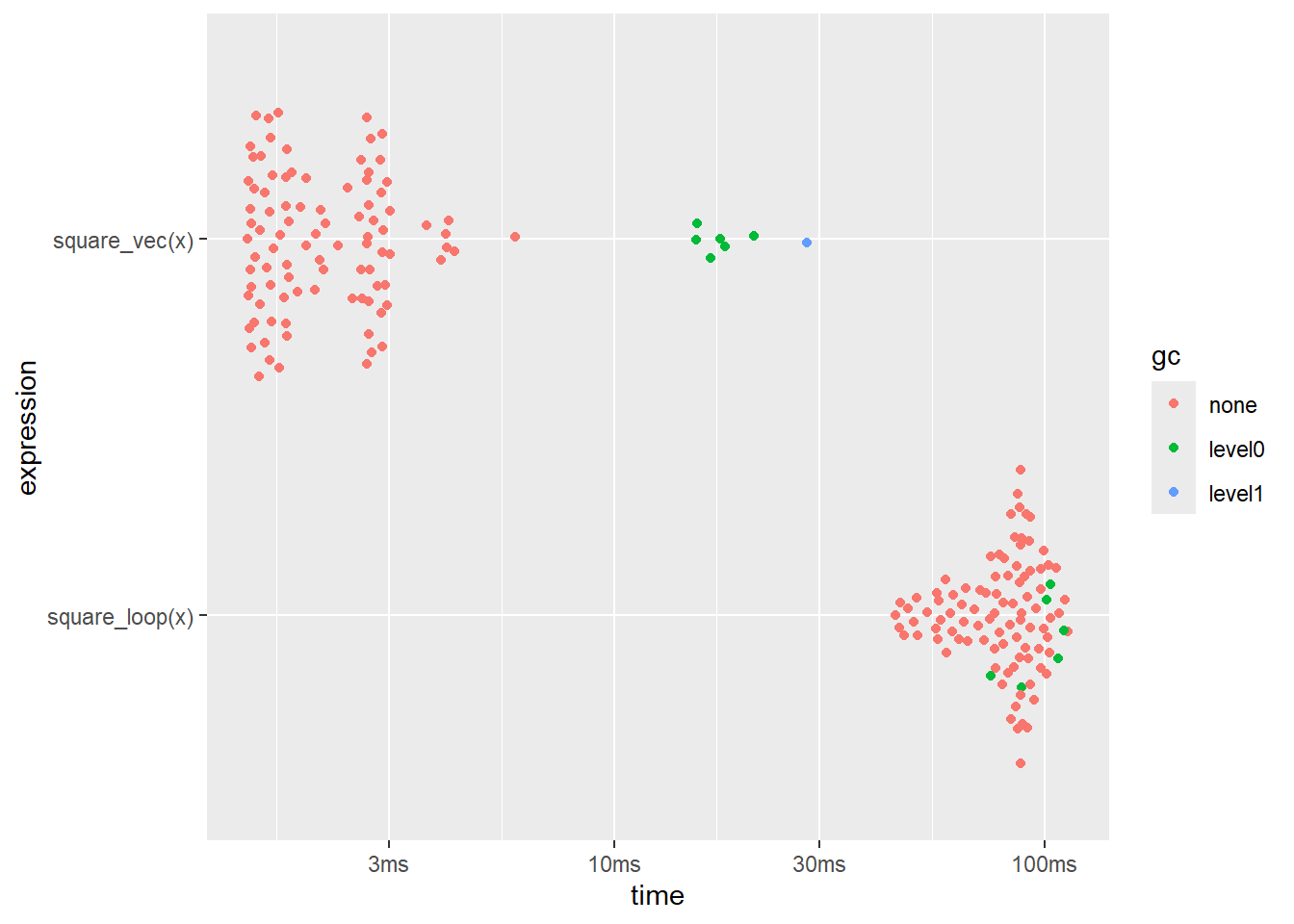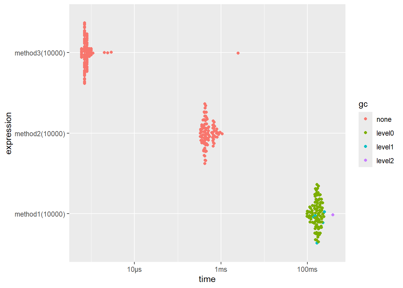 result <- bench::mark( method1(1e4), method2(1e4), method3(1e4), iterations = 100, time_unit = "ms" ) result[c("expression", "min", "median", "itr/sec", "n_gc")]