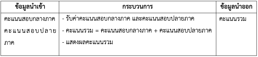 เริ่มต้นด้วยการรับค่าคะแนนสอบกลางภาค และรับค่าคะแนนสอบปลายภาค จากนั้นคำนวณหาคะแนนรวมโดยนำคะแนนสอบกลางภาคมาบวกกับคะแนนสอบปลายภาค แล้วแสดงผลรวมของคะแนนออกทางจอภาพ