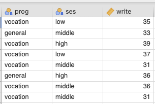 - “ses”: เป็นตัวแปรทำนายที่เป็นแบบหมวดหมู่ที่มี 3 ระดับ (three-level categorical variable) แทนสถานะทางเศรษฐกิจสังคม (social economic status)