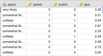 “rank” เป็นตัวแปรที่มีค่าเป็น 1 ถึง 4 ซึ่งบ่งบอกถึงระดับของสถาบันการศึกษา โดยที่ 1 คือมีชื่อเสียงสูงที่สุดและ 4 คือมีชื่อเสียงต่ำที่สุด