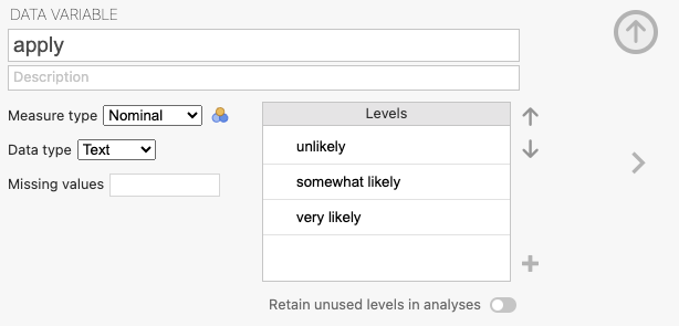 ชุดข้อมูลที่สมมตินี้มีตัวแปร outcome ที่มีระดับสามระดับชื่อ apply โดยมีระดับ “unlikely”, “somewhat likely”, และ “very likely” ตามลำดับ. เราจะใช้ตัวแปรนี้เป็นตัวแปรตาม (outcome variable)