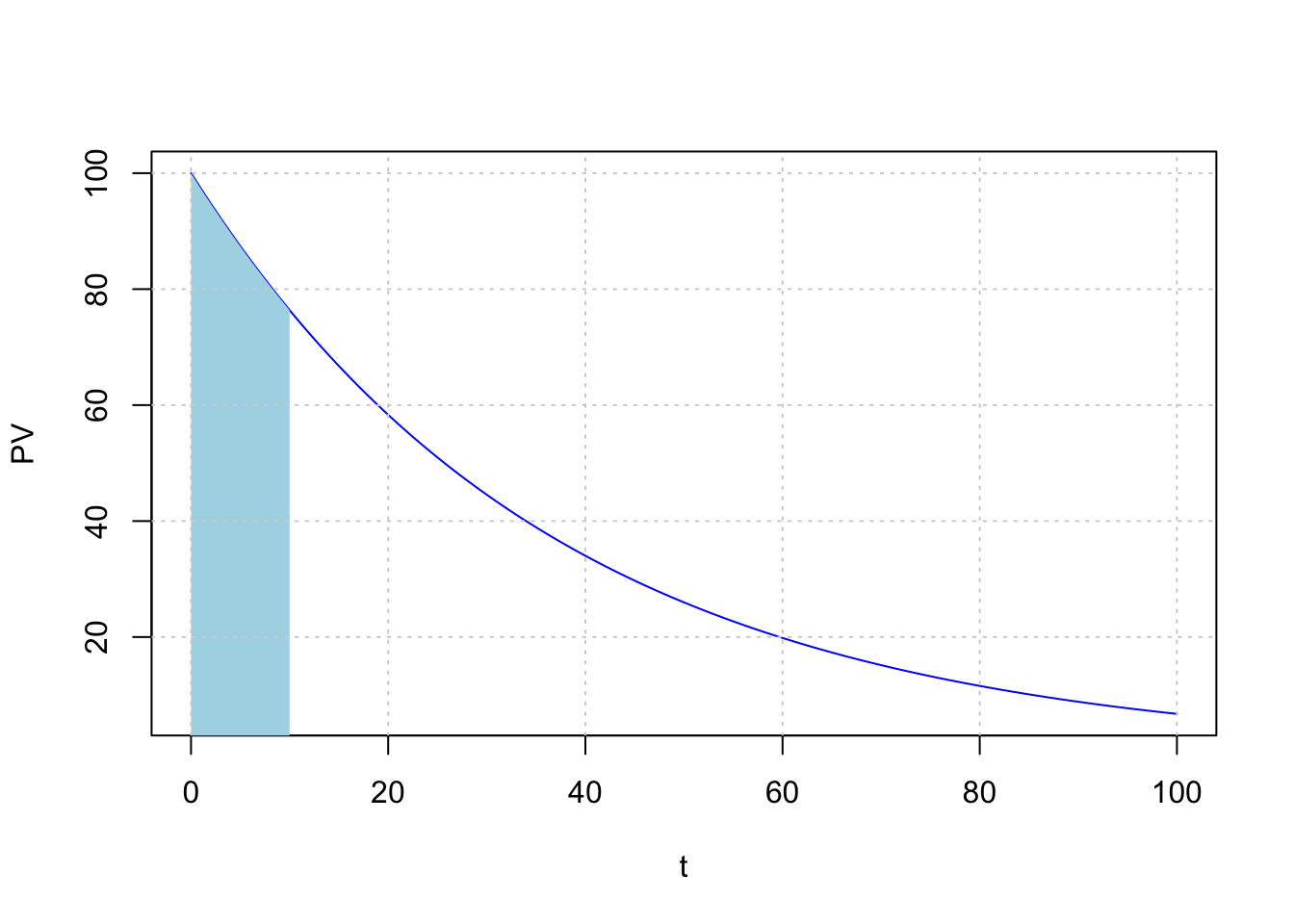 PV <- subs(PV, r, 0.08)\[100 {1.08}^{- t} e^{0.05 t}\]