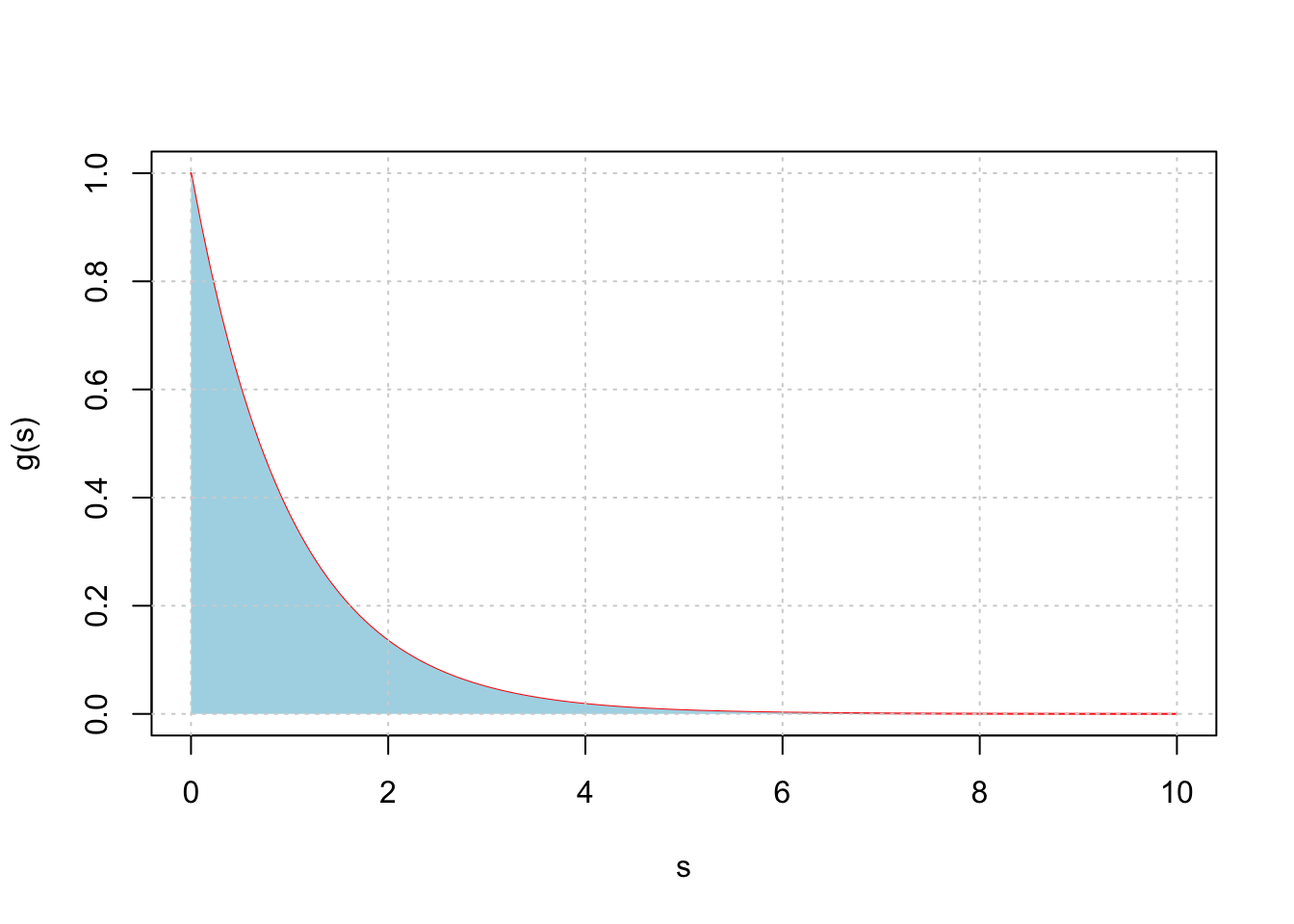 curve(gs, from = 0, to = 10, col = "red", ylab = "g(s)", xlab = "s")