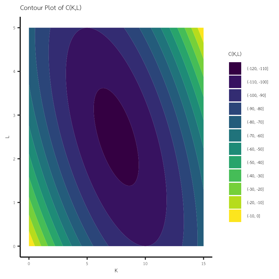 ผู้ผลิตต้องการผลิตที่ \(C = x^2 + 2y^2\) ให้น้อยที่สุด ภายใต้ข้อจำกัด \(x + y = 6\)