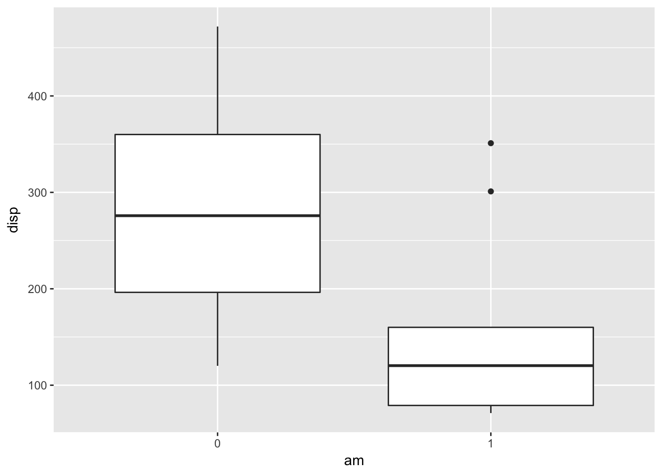 ggplot(mtcars, aes(x = am, y = disp)) + geom_boxplot()
