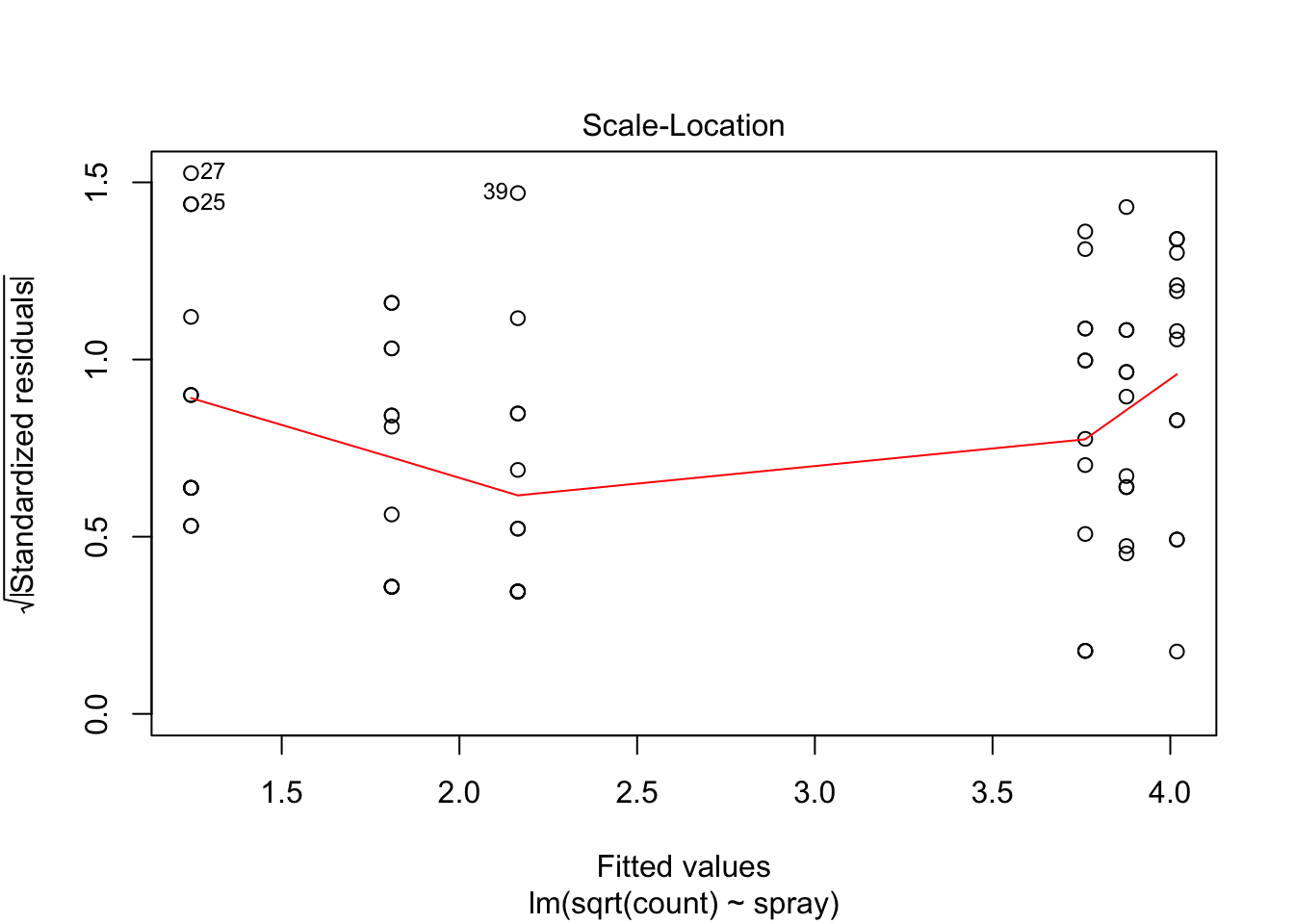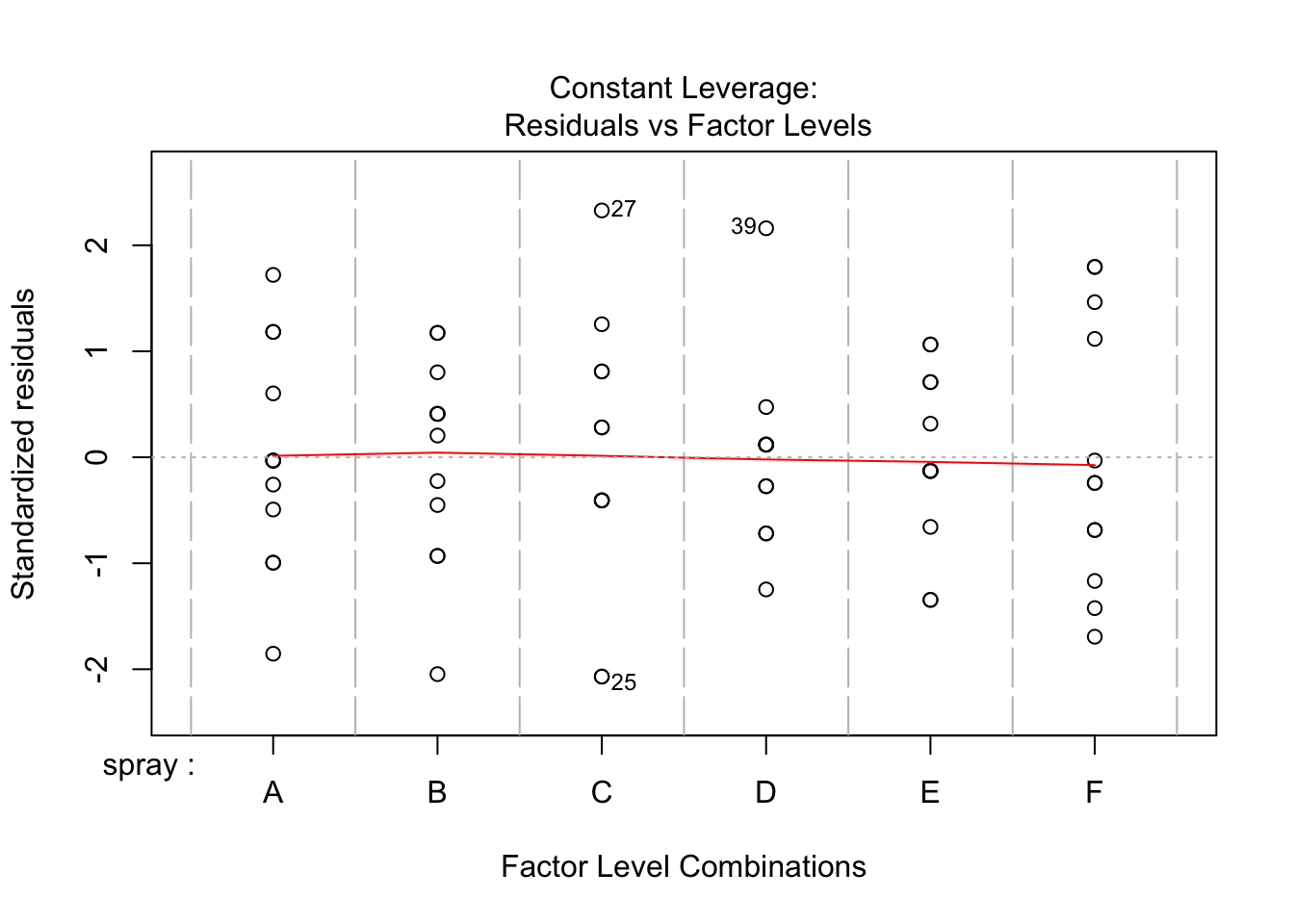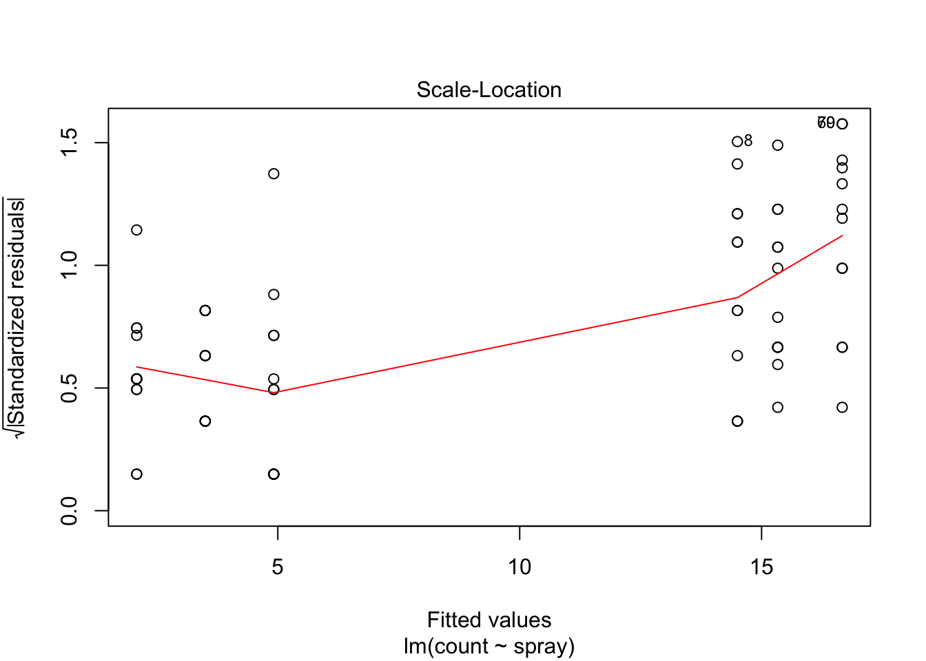 However, it is also clear from the boxplot that the assumption of equal variances is violated. The three effective sprays C, D, and E, have visibly less variance than the other three sprays. In this example, the sprays with smaller counts have smaller variance. This phenomenon is known as heteroskedacity, and is fairly common. The residual plots show it well, especially the Scale-Location plot