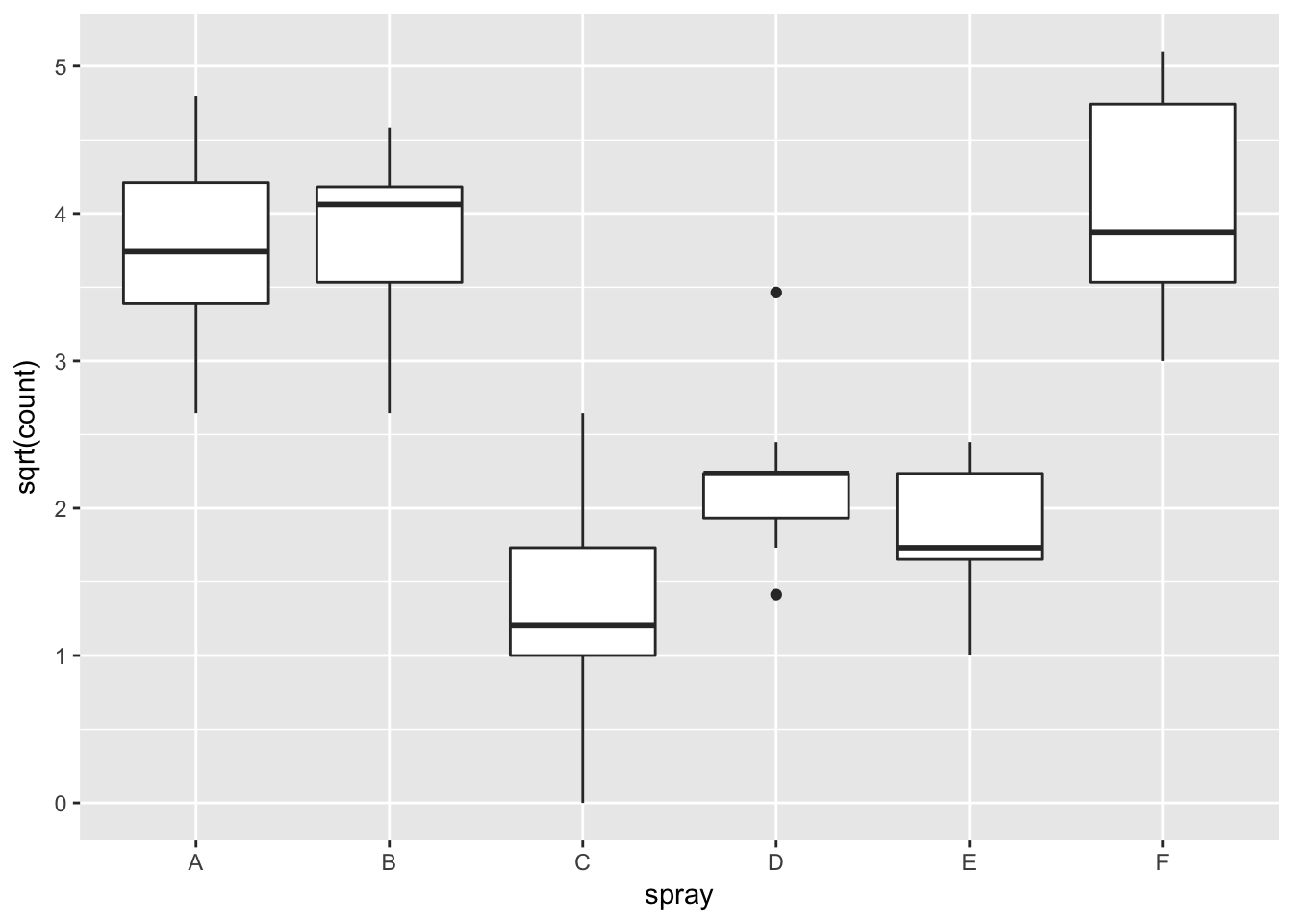 ggplot(InsectSprays, aes(x = spray, y = sqrt(count))) + geom_boxplot()