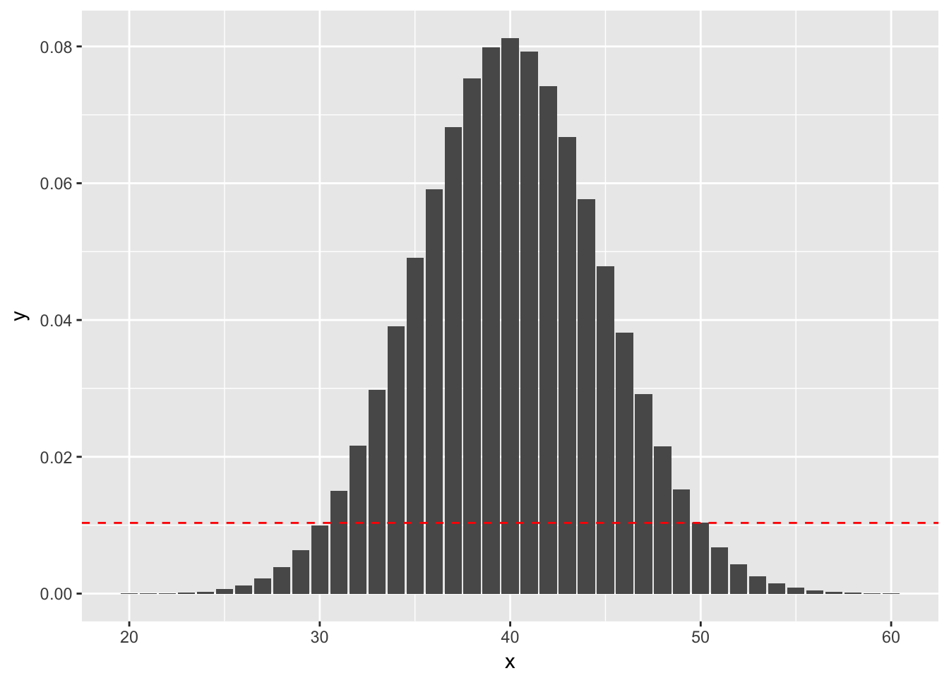 geom_abline(slope = 0, intercept = dbinom(30, 100, 0.4), linetype = "dashed", color = "red")