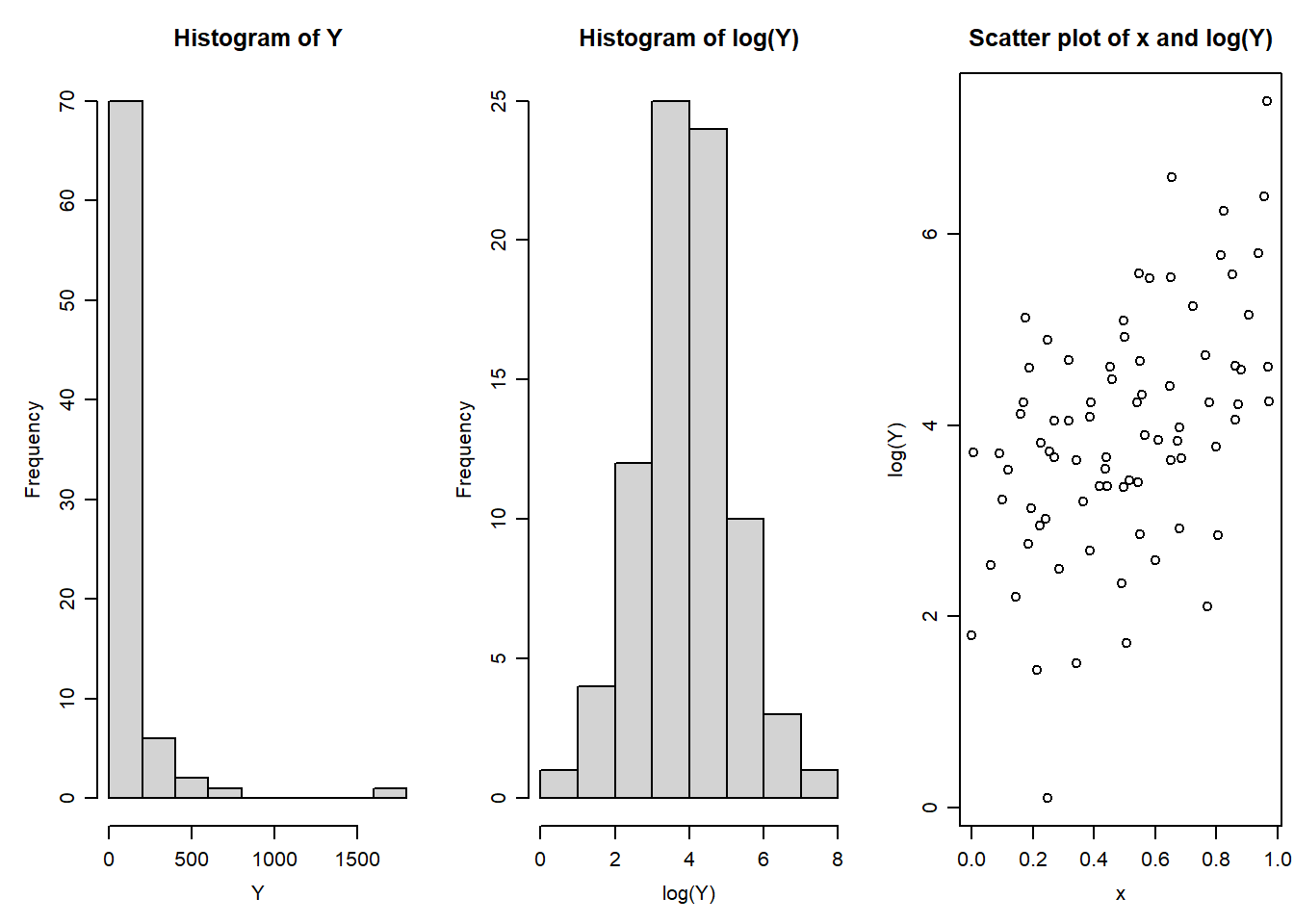 This example is a rather extreme case with respect to the distribution of the covariate and it is probably fair to say that transformations of \(x\) are not usually as important to consider as transformations of the outcome. Since the linear model takes the values of \(x\) as given, so there is no modelling of their distribution, there is no formal need to obtain a “nice” symmetric distribution of the independent variable. However, when we discuss the concept of leverage in week 3 we will see that highly skewed \(x\) distributions are undesirable because they may lead to just one or two observations having an unduly large influence on the estimated regression model.