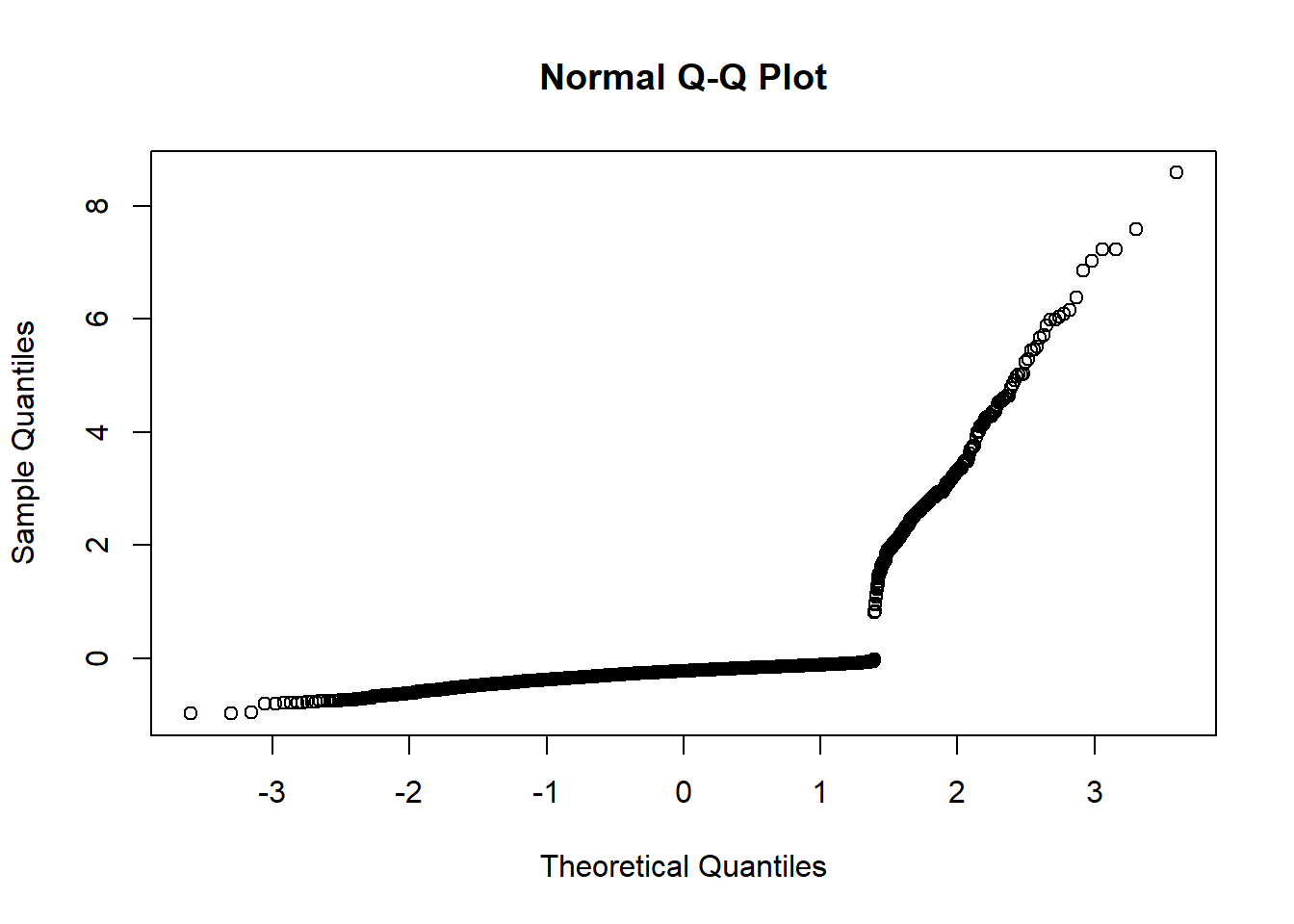 We said earlier that we should not expect the Pearson or deviance residuals to be normally distributed. What happens if we draw a normal probability plot anyway? The figure below displays such a plot and we can clearly see the separation between two groups based on the outcome status and plot is a broken line.