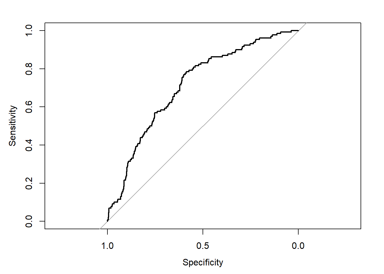 out## ## Call:## roc.default(response = wcgs1.val$chd69, predictor = wcgs1.val$pred, ci = TRUE, plot = TRUE)## ## Data: wcgs1.val$pred in 1415 controls (wcgs1.val$chd69 0) < 130 cases (wcgs1.val$chd69 1).## Area under the curve: 0.7127## 95% CI: 0.6694-0.756 (DeLong)