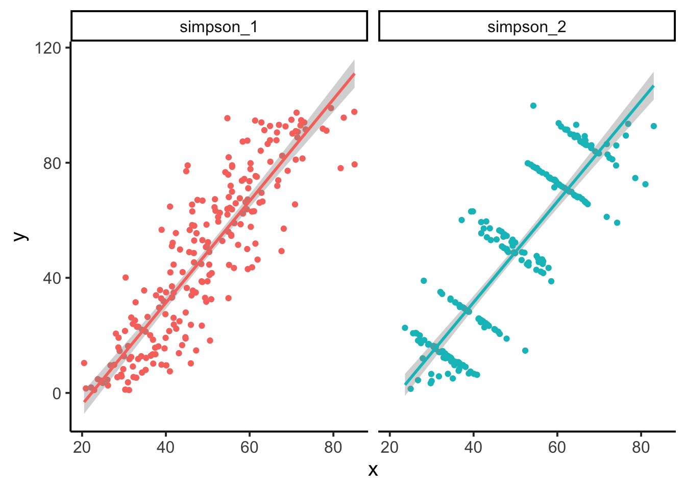Other Factors If you plot a comparison and see a relationship, ask what other variables may influence it (rarely are two variables solely responsible for an entire story). We certainly hope to see strong and interpretable relationships in the data we plot, but assume there is always more to the story. Here is a good time to consider the effects of groups. Might group membership of your plotted data tell a different story? This was certainly the case for Simpson’s Paradox (Simpson 1951). (The example below was done using data from the package datasauRus, which you are encouraged to check out for more examples on this topic.)