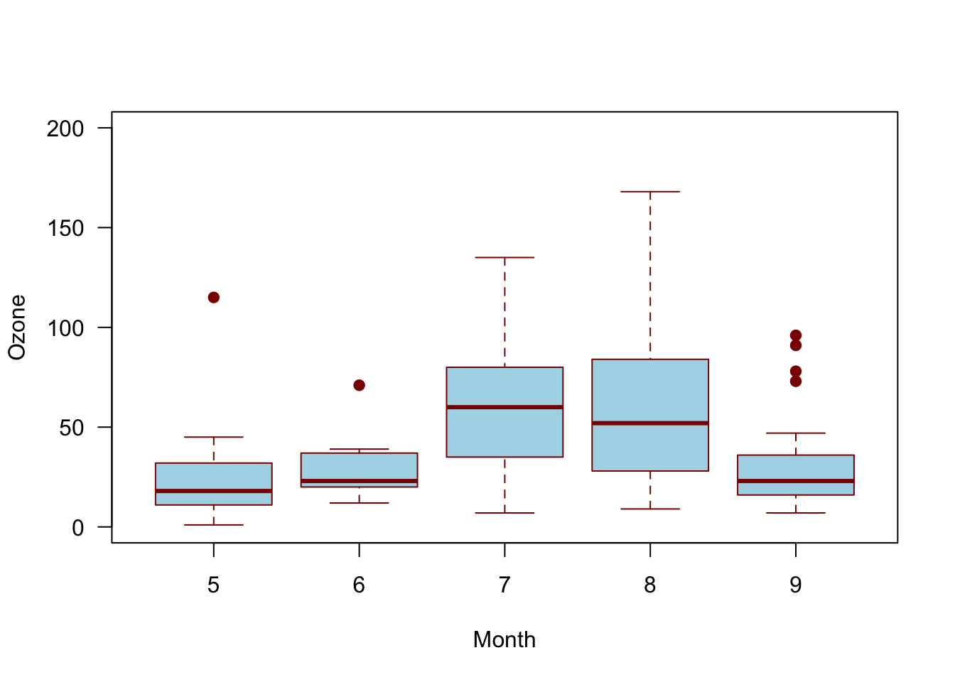 The boxplot is one of the more undervalued plots for data—both for exploratory work and final presentation. So often when bar plots are used incorrectly, it is actually a box plot that is the appropriate plot. Boxplot show distributional information for data. Typically the box represents the IQR (interquartile range), the center line represents the median, and the whiskers represent some extreme of the data. However, one mistake that is often made with boxplots is that the boxplot features are not described in the figure caption. You might not be captioning all your exploratory plots, but for final renderings, be sure to state what the box represents, what the whiskers represent, and so on. It might be obvious to you, but boxplot symbology is not universal!