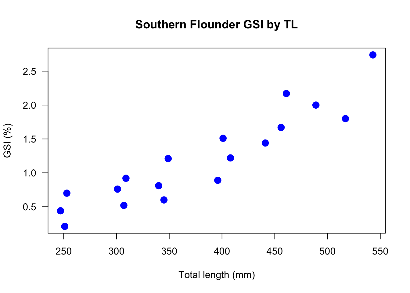 Recall the scatterplot above that was created with only plot(GSI ~ TL). By changing some of the plot arguments, we can clean up the plot, make it more visually appealing, and also (hopefully) improve information transfer. The code below create the high-level plot, but then adds labels, changes symbol type, size, and color, and also rotates the y-axis label for improved readability.