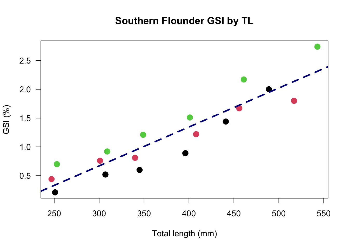 In the above figure, we have changed the color not to a specific color, but to reflect the location. (The location factors are interpreted alphabetically or numerically and assigned the default R color palette, where 1 = black, 2 = red, etc.) We have also added a line, using the abline() function. The a and b represent the intercept and slope, respectively, and can be specificed as numbers. Because we did not know these numbers of the top of our head, we stated that the intercept, a is the first coefficient produced by the linear model (lm()) of GSI regressed against TL. The slope is the second coefficient produced by that same model. We will cover all of this more in depth in the linear modeling chapter of this text, but this is just a brief explanation of how these numbers can be calcualted and plotted all in the same function.