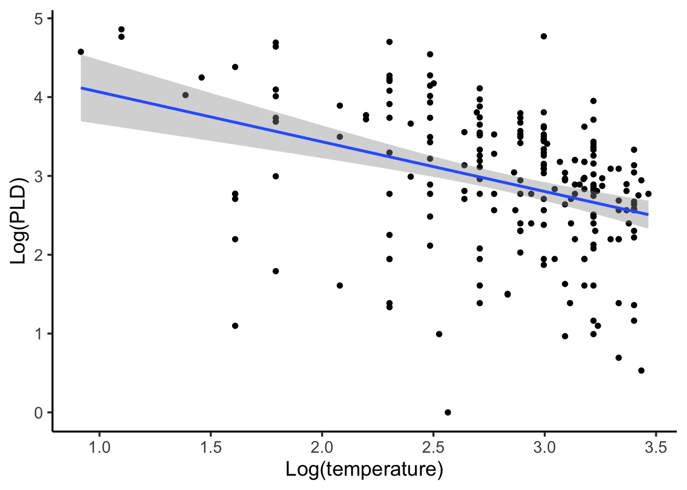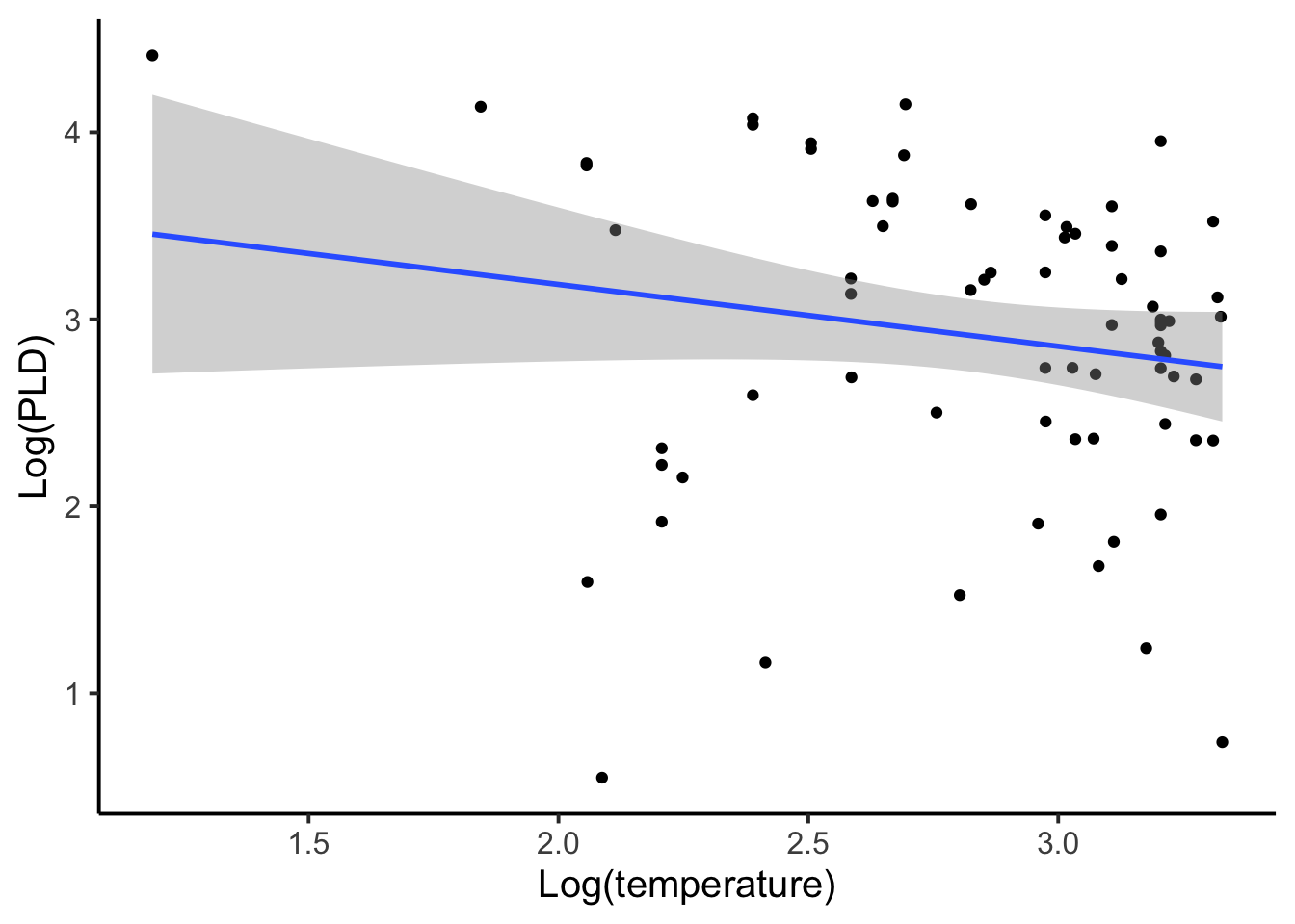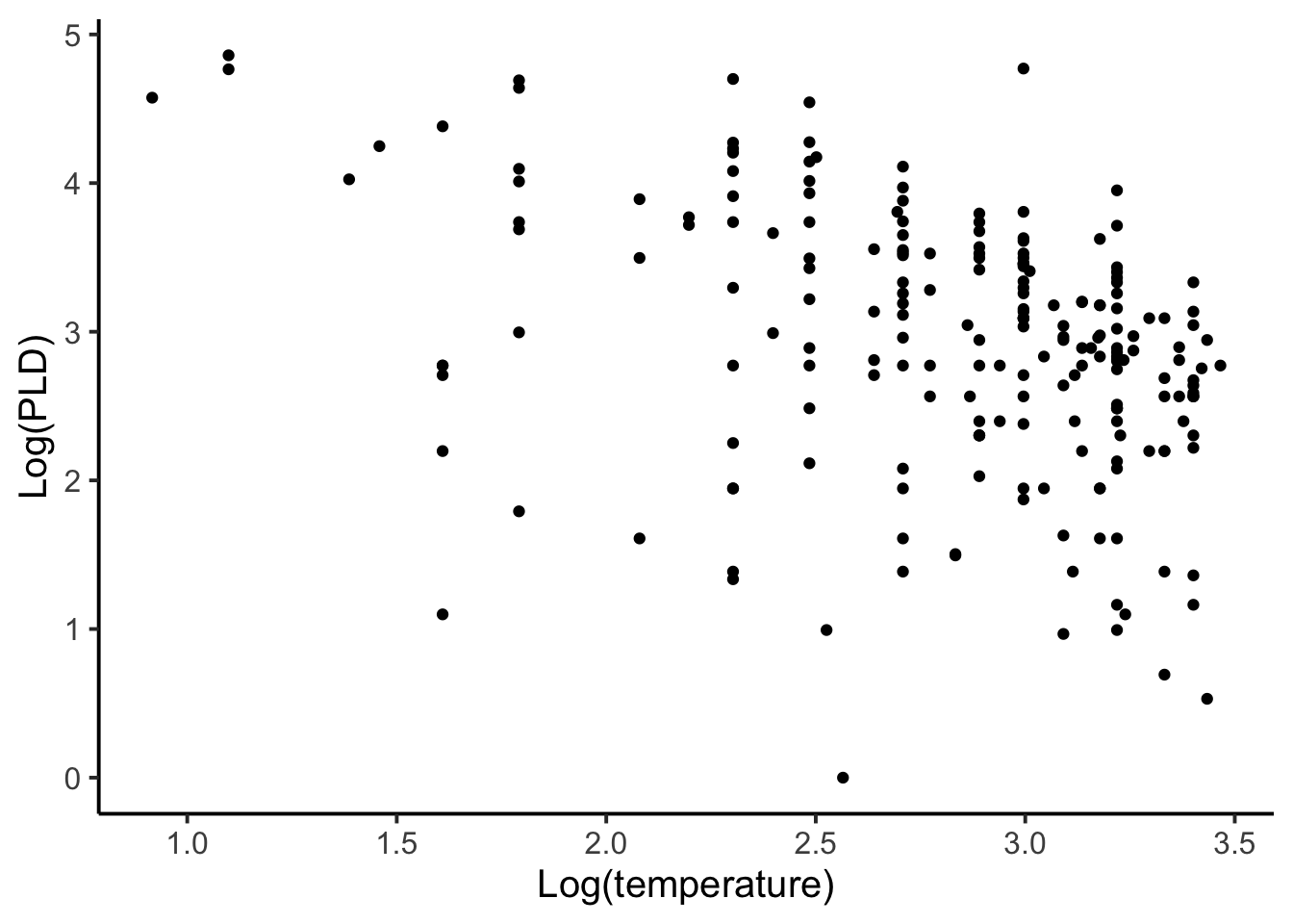 ggplot(mol, aes(y = l.pld, x = l.temp)) +