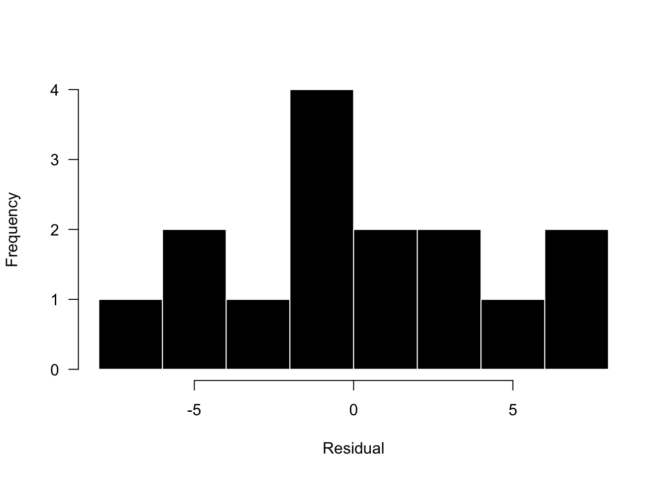 Based on this plot, the residuals look OK. This data set is quite small (n=15), so it would be hard to get a nice symmetric shape, but we see most residuals centered around 0 and the magnitude of positive and negative residuals is about the same. Again, these plots don’t need to look pretty, they just need to not show some bias in the model fitting.