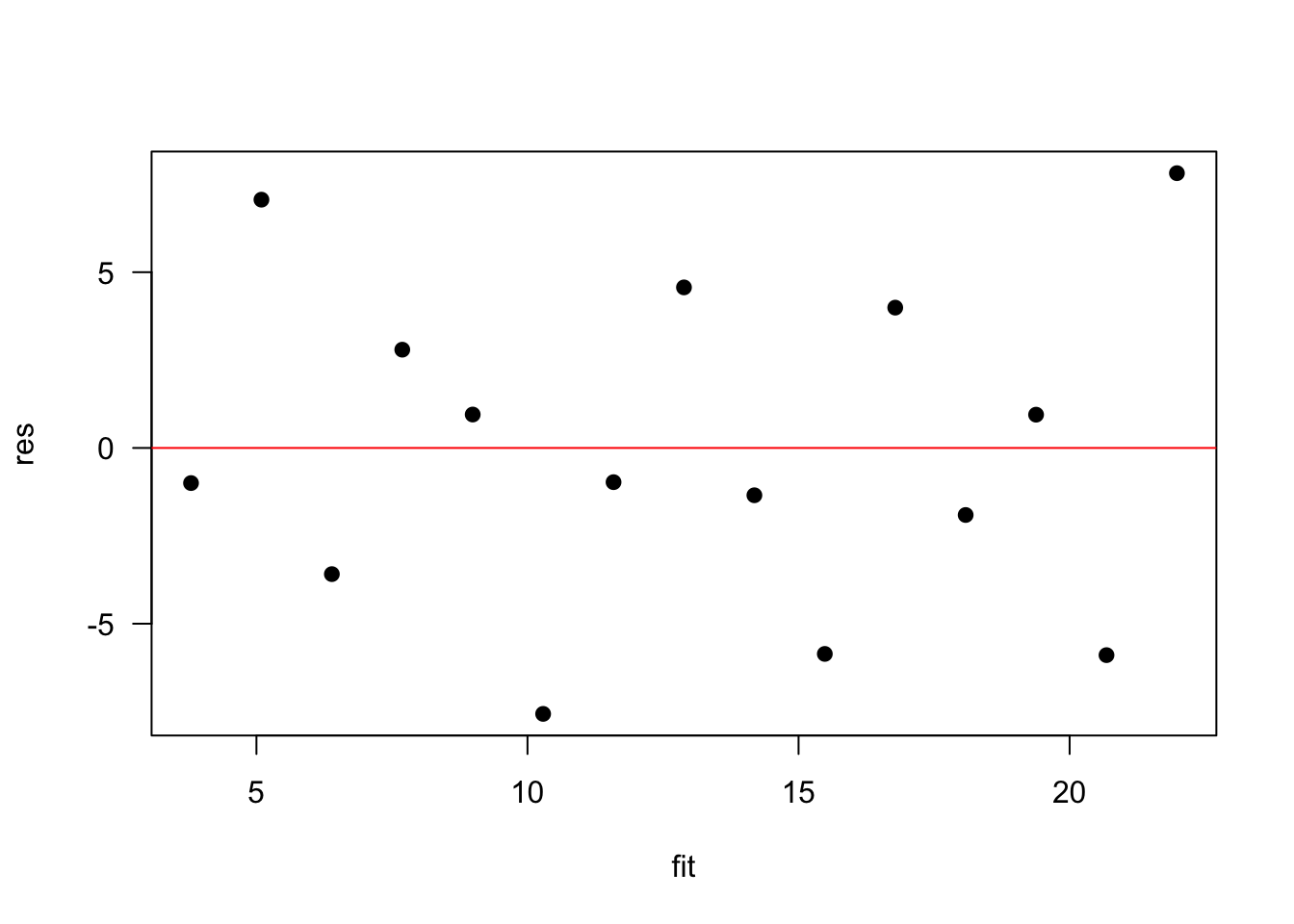 plot(res ~ fit, pch=19, las=1); abline(0,0, col="red")
