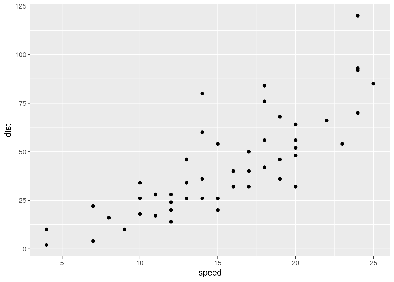 ggplot(data = cars, aes(x = speed, y = dist)) +