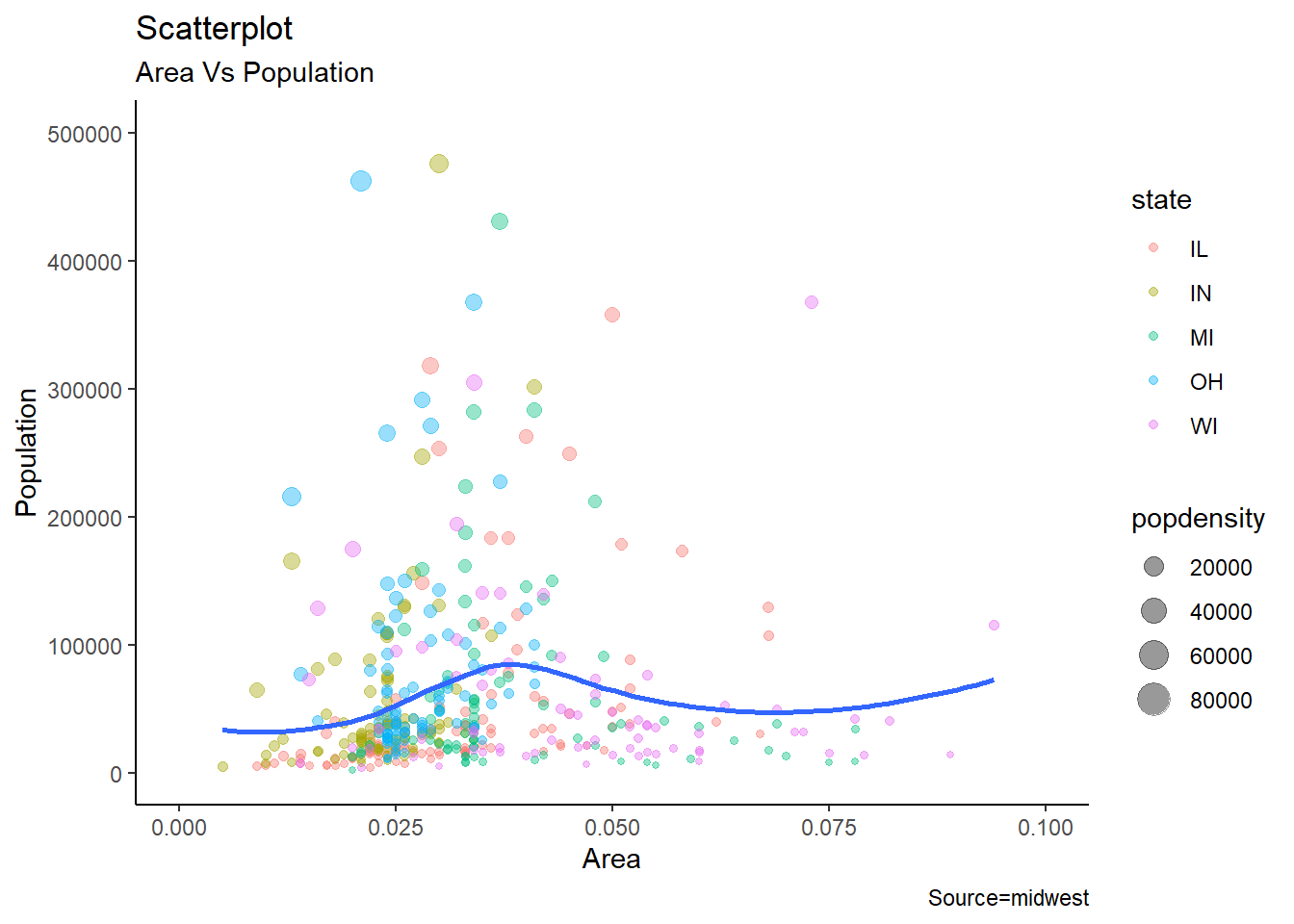 labs(title="Scatterplot", subtitle = "Area Vs Population", x="Area" , y="Population", caption ="Source=midwest")## `geom_smooth()` using method = 'loess' and formula 'y ~ x'
