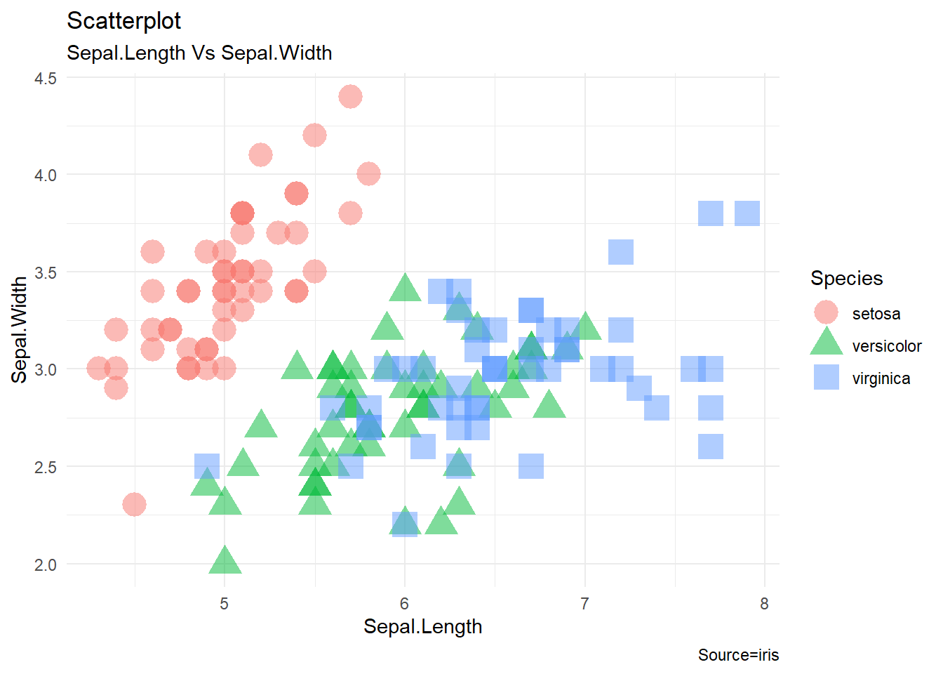 ggplot(iris, aes(Sepal.Length, Sepal.Width, shape=Species, color=Species))+ geom_point(alpha=0.5, size=6)+ theme_minimal()+ labs(title="Scatterplot", subtitle = "Sepal.Length Vs Sepal.Width", caption ="Source=iris")