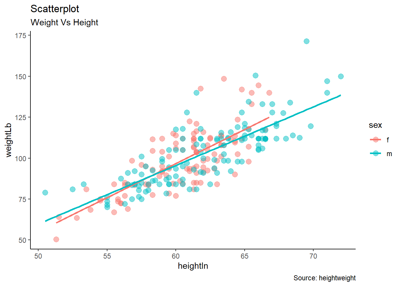 labs(title = "Scatterplot", subtitle = "Weight Vs Height", caption = "Source: heightweight")## `geom_smooth()` using formula 'y ~ x'