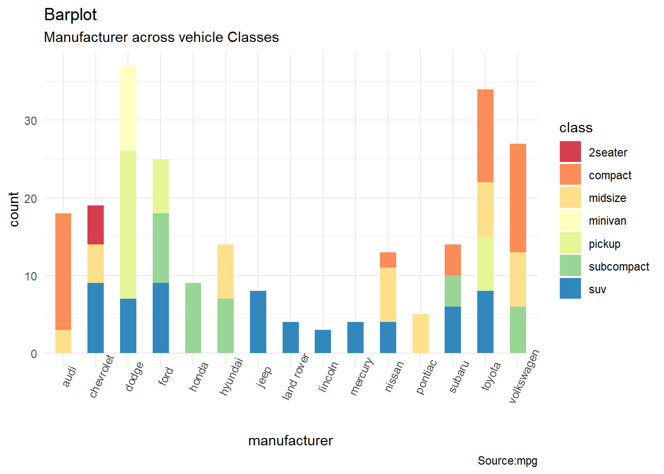 labs(title="Barplot", subtitle = "Manufacturer across vehicle Classes", caption = "Source:mpg")