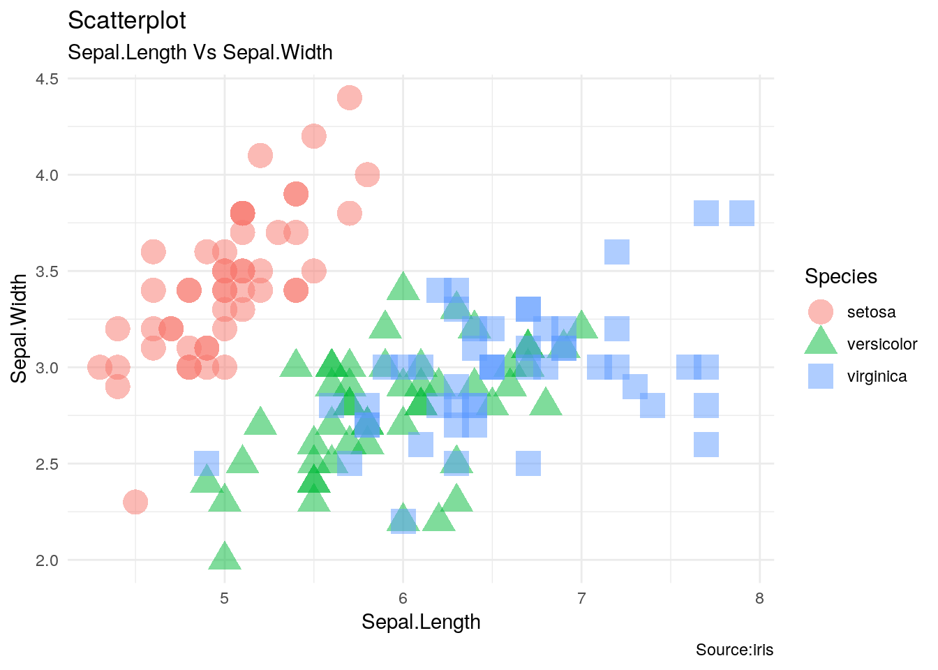 ggplot(iris, aes(Sepal.Length, Sepal.Width, shape=Species, color=Species))+ geom_point(size=6, alpha=0.5)+ theme_minimal()+ labs(title = "Scatterplot", subtitle = "Sepal.Length Vs Sepal.Width", caption="Source:iris")