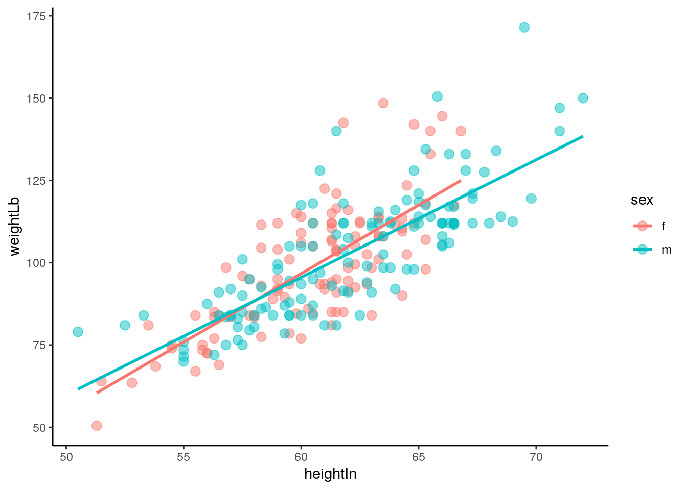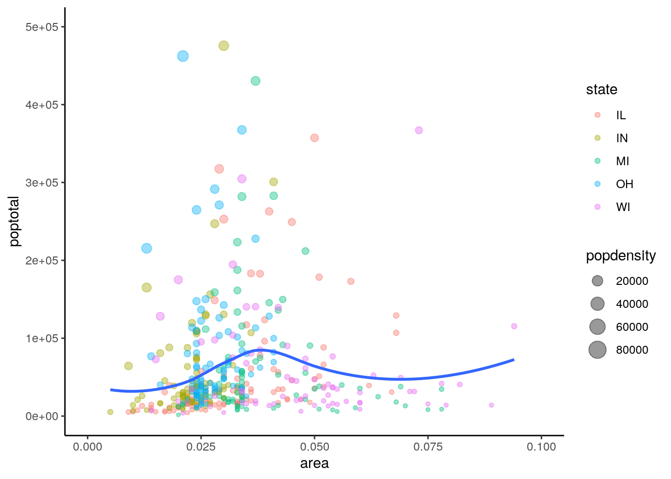ggplot(data=midwest, aes(x=area, y=poptotal))+geom_point(aes(color=state, size=popdensity),alpha=0.4)+geom_smooth(se=FALSE)+scale_x_continuous(limits=c(0,0.1))+scale_y_continuous(limits=c(0, 500000))+theme_classic()## `geom_smooth()` using method = 'loess' and formula 'y ~ x'