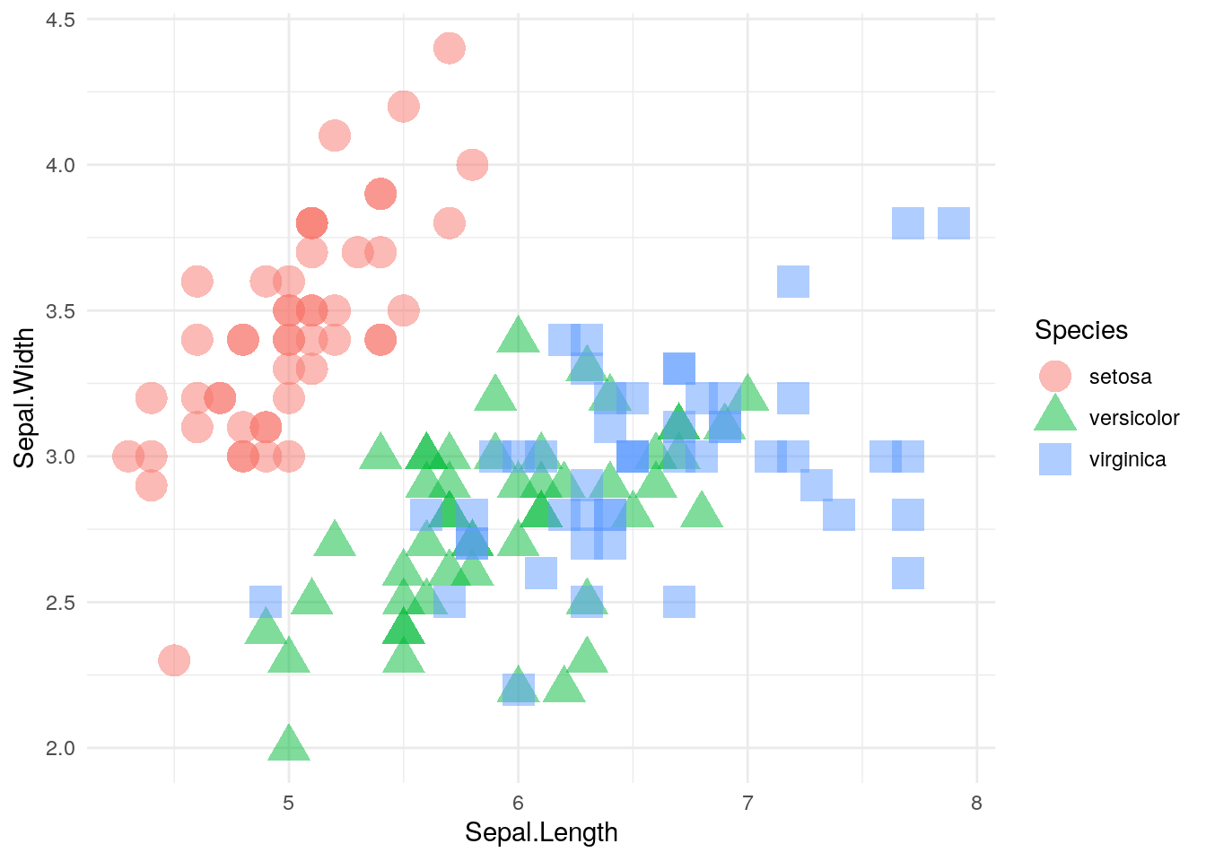 ggplot(data=iris, aes(x=Sepal.Length, y=Sepal.Width))+geom_point(aes(color=Species, shape=Species), size=6,alpha=0.5)+theme_minimal()