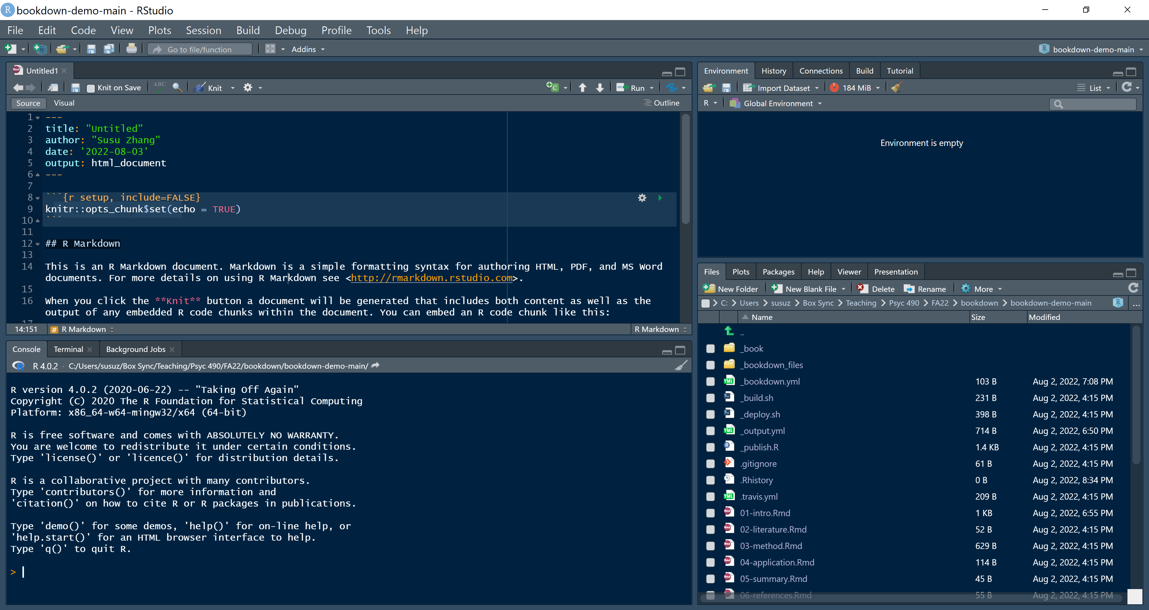 .Rmd): a file for generating reports, websites, and presentations, where you can include text, formula, figures, and embed R code chunks. Code you write in the source pane will not be executed unless you press Run (or equivalent.)
