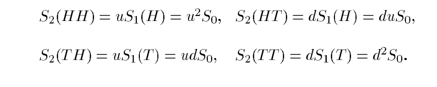 Let us imagine that we are tossing a balanced coin (\(p=1/2\)), and when we get a âHeadâ (\(H\)) the stock price moves up of a factor \(u\), but when we get a âTailâ (\(T\)) the price moves down of a factor \(d\). We denote the price at time \(t_1\) by \(S_1(H)=u S_0\) if the toss results in head (\(H\)), and by \(S_1(T)=d S_0\) if it results in tail (\(T\)). After the second toss, the price will be one of:
