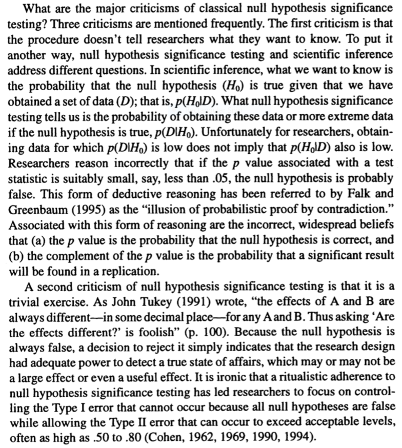 This idea of “null hypothesis significance testing” (remember, a null hypothesis is the way you think the world works, and the significance testing part tells you how likely you are to see your data if the null hypothesis were true) has been heavily challenged for educational research. Here is a quote from a seminal article on the subject (Kirk 1996):