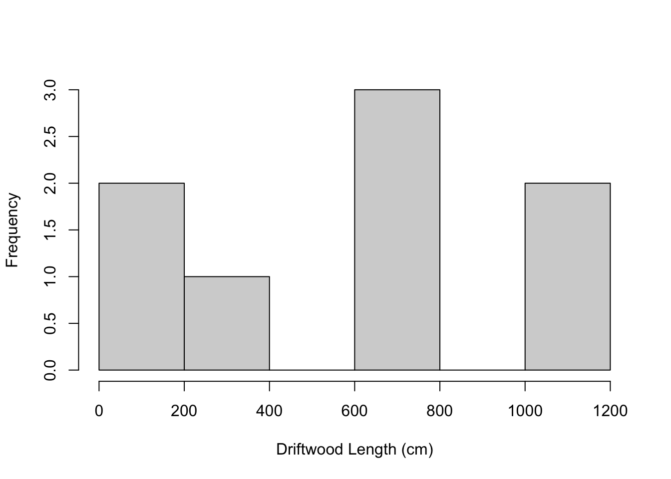 hist(x, xlab="Driftwood Length (cm)", main="")