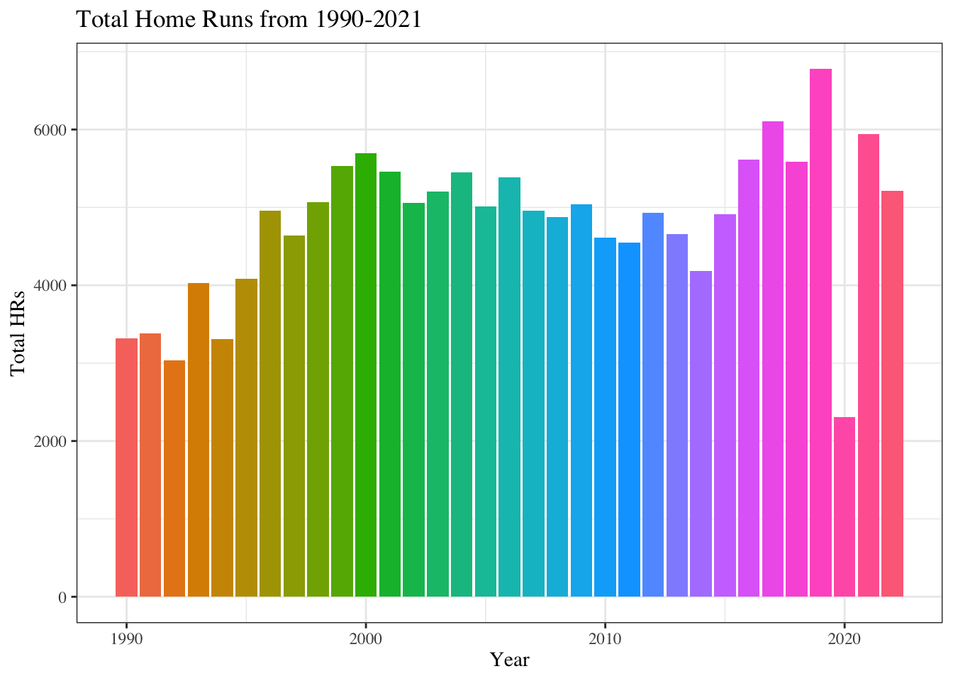 labs(title = "Total Home Runs from 1990-2021", x = "Year", y = "Total HRs") +