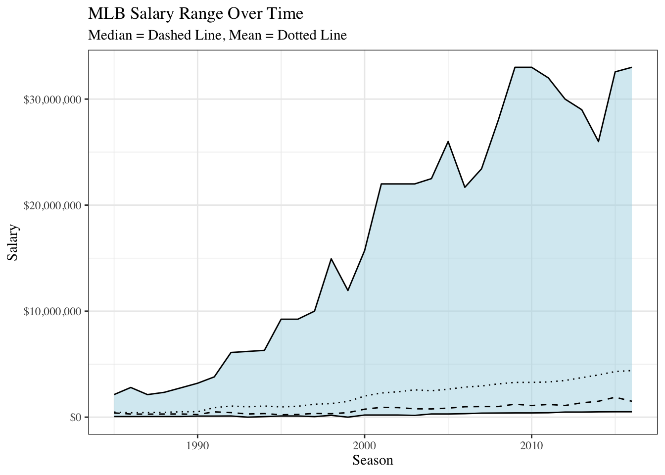 labs(title = "MLB Salary Range Over Time",