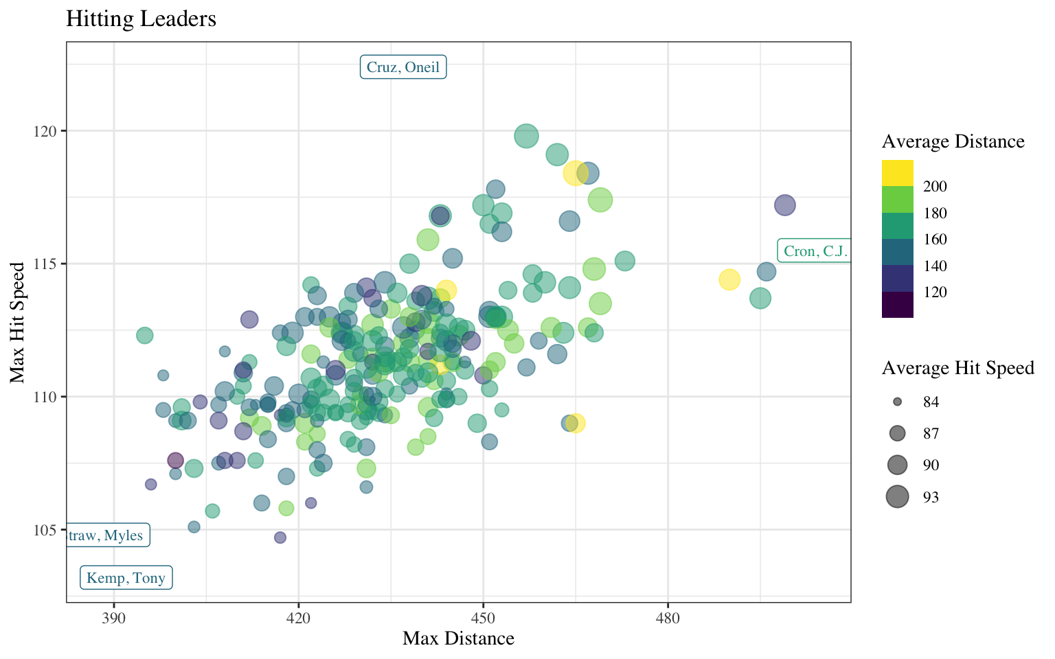 labs(title = "Hitting Leaders", x = "Max Distance", y = "Max Hit Speed",