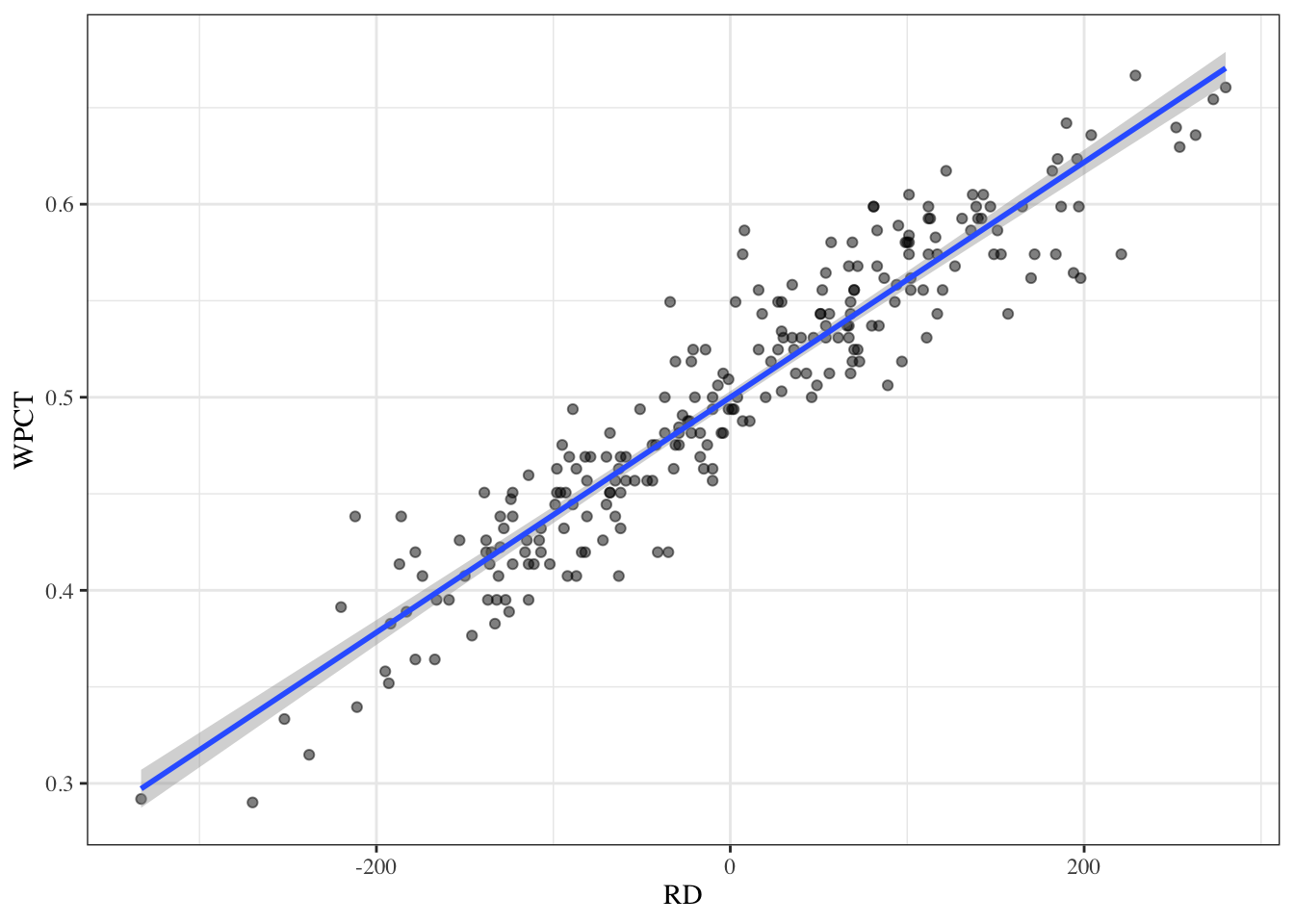 ## lm(formula = WPCT ~ RD, data = team_pred)