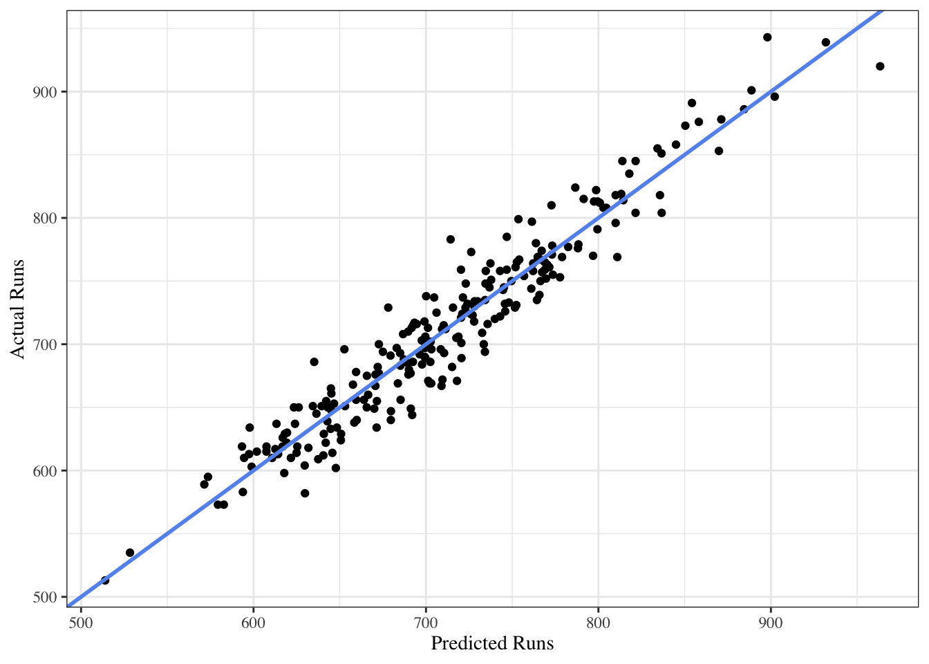 \[\text{Predicted Win Pct} = 0.500 + 0.00061 * \text{Run Diff}\]