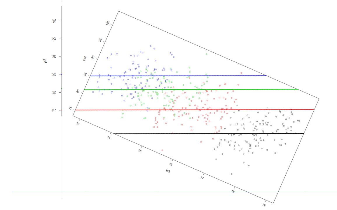 Actually, what the ANCOVA model does is equivalent to looking at the data by rotating the left plot above and see it in the “axis” we care about. That corresponds to the axis such that the slope of the regression lines are aligned with the x-axis of the Cartesian referential.