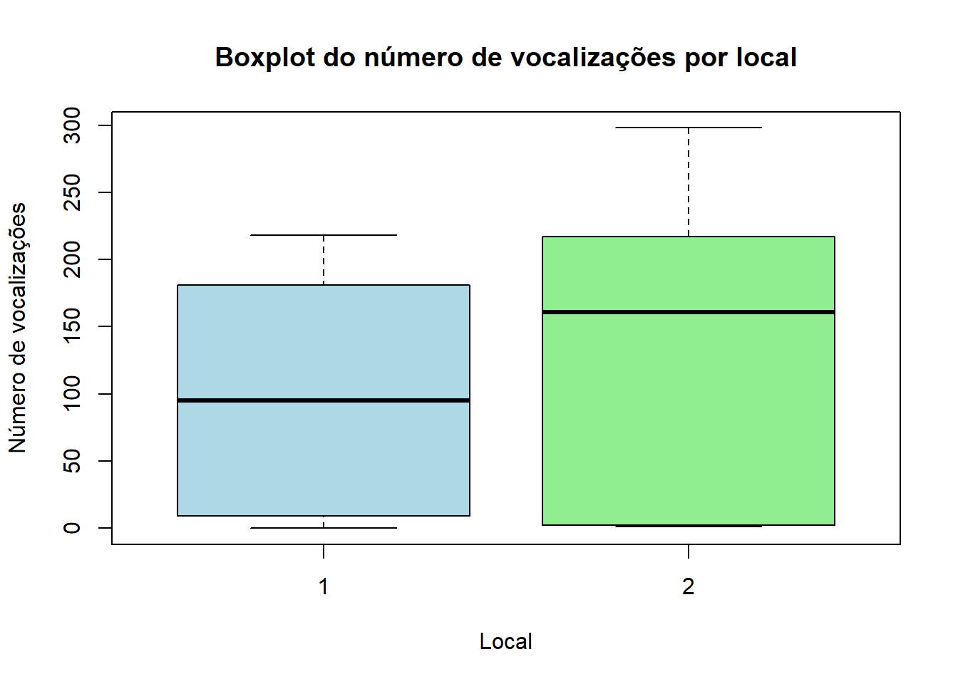 O gráfico representa o número de localizações por local em ambos os locais amostrados. É possível observar uma grande variabilidade do número de vocalizações, sendo que esta variabilidade é superior no local 2.