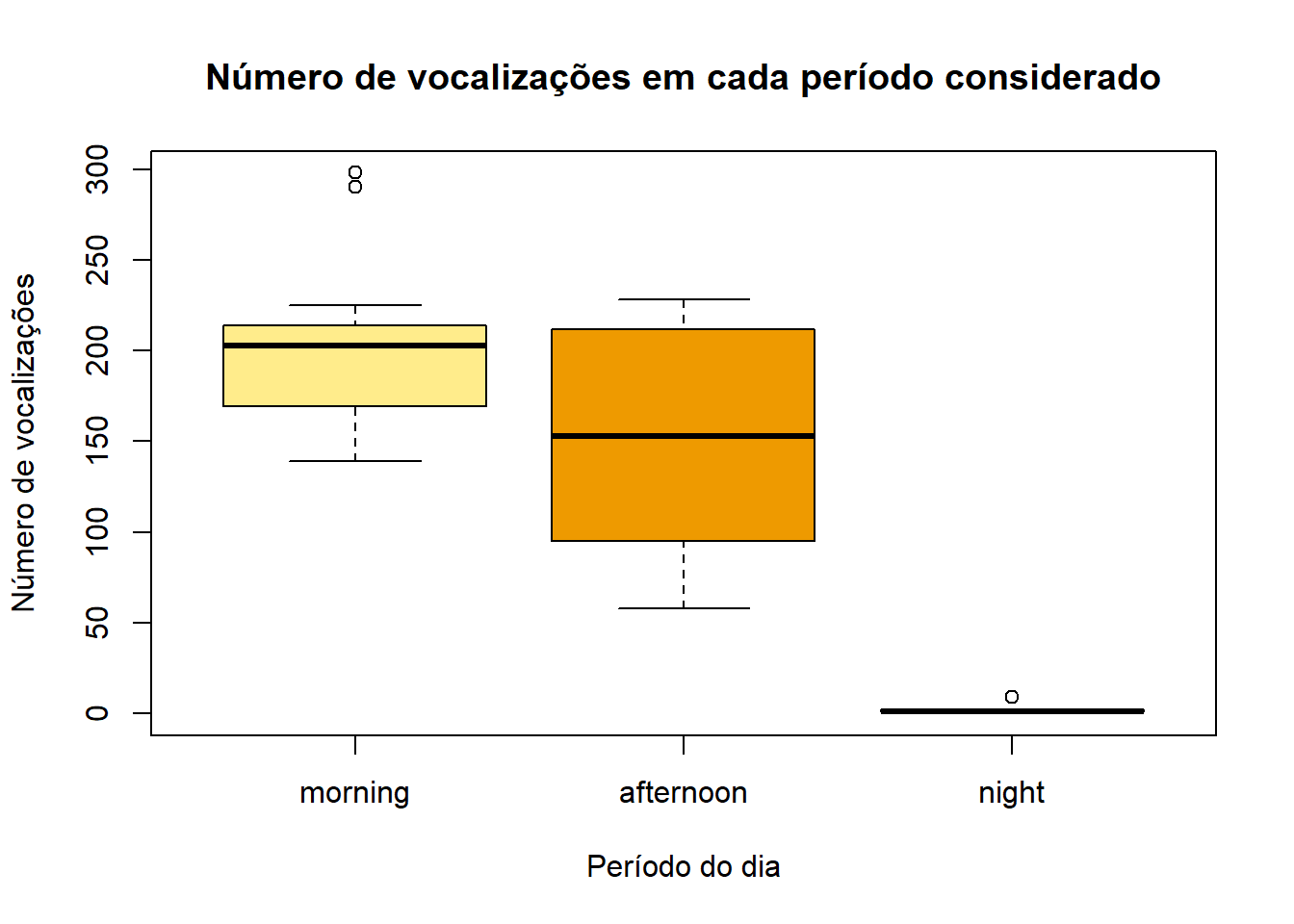 boxplot(X52553GonFer$vocal~X52553GonFer$priod,xlab="Período do dia",ylab="Número de vocalizações",main="Número de vocalizações em cada período considerado", col=c("lightgoldenrod1","orange2","blue"))