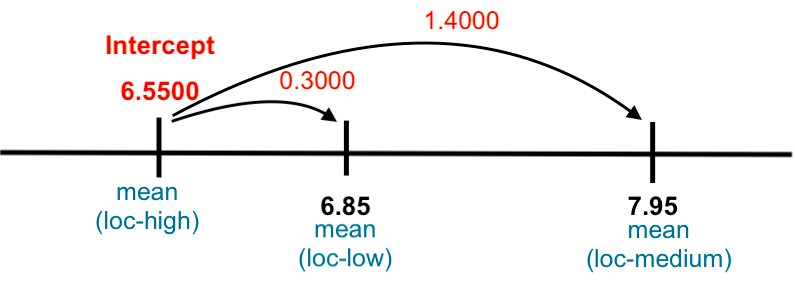 O modelo linear neste caso pega no valor basal (a menor média entre as médias dos grupos) que identifica como intercept, neste caso a média do lochigh. De seguida, subtrai à média dos outros grupos o valor do intercept, obtendo os valores das diferenças entre estas médias e o valor basal. O modelo vai, deste modo, interpretar se as variâncias entre estas médias são estatisticamente significativas, ou não. Neste caso, ao não rejeitarmos H0 concluímos que as diferenças entre médias não são significativas.