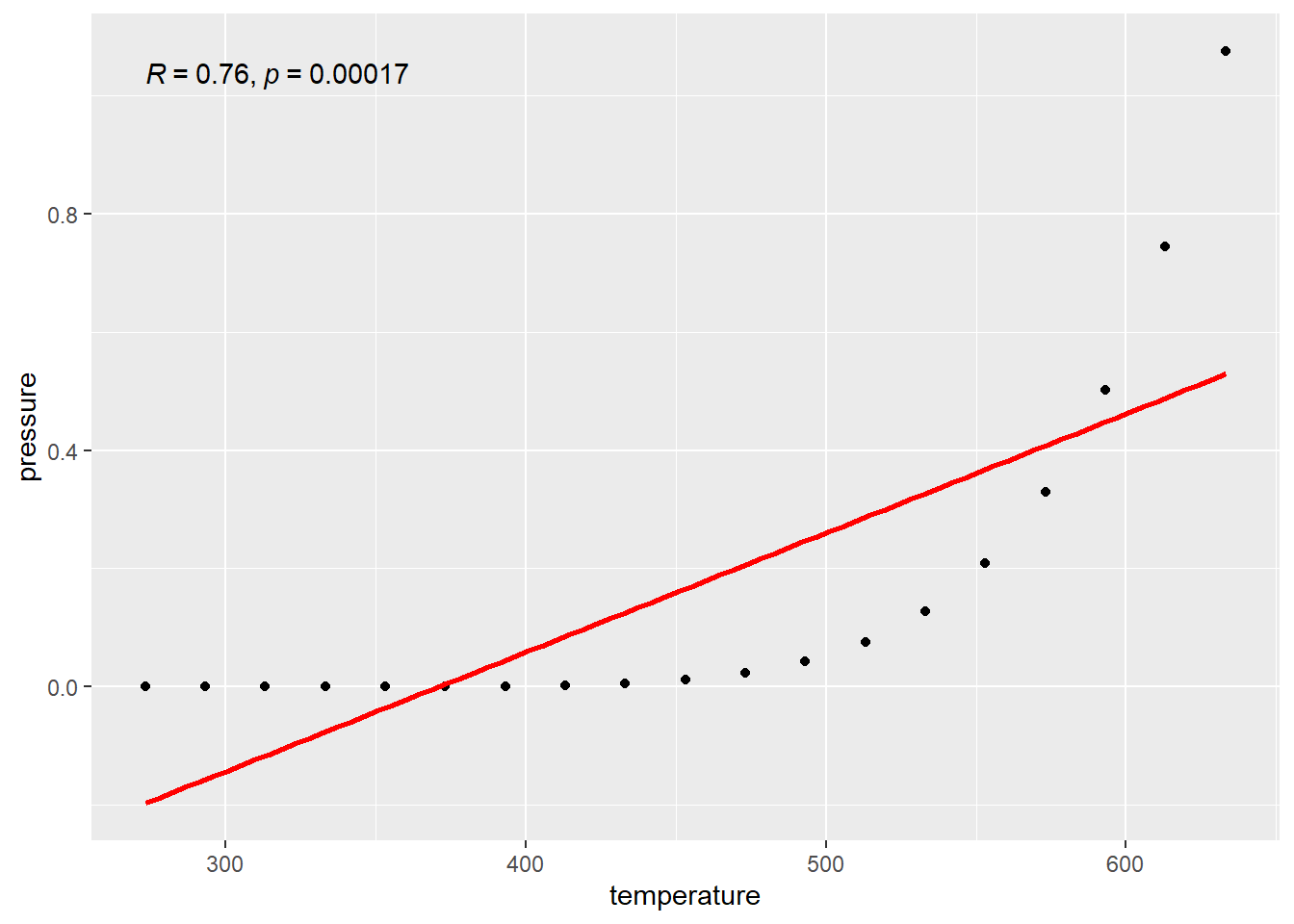 This \(r\) value only measures how well the data follow a LINE. So if there isn’t a linear relationship, \(r\) won’t capture all the information about the relationship. The value for \(r\) in the pressure data is given in the top right corner of the graph here. Notice that it is a capital R. This is because of “notation forking” in math, i.e., someone using a different symbol for the same thing. This wouldn’t be so bad except for the fact that academics who make this kind of shit are egotistical shits and think their idea is better. Which was first, \(r\), or \(R\)? I don’t know. I use \(r\), whatever.